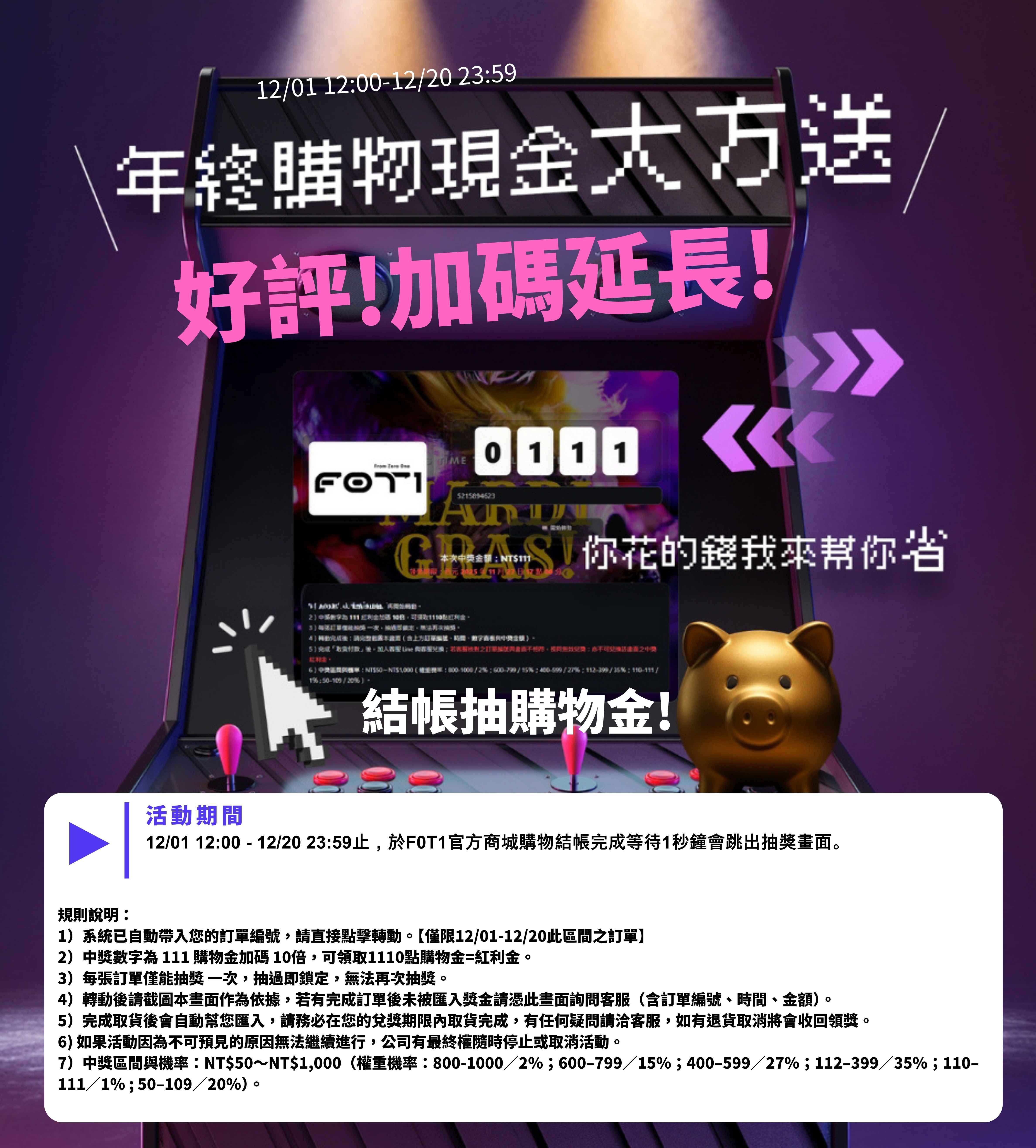 ※ 詳細抽購物金辦法可參考12月攻略活動或結帳完成點擊畫面即可參加購物金轉轉樂