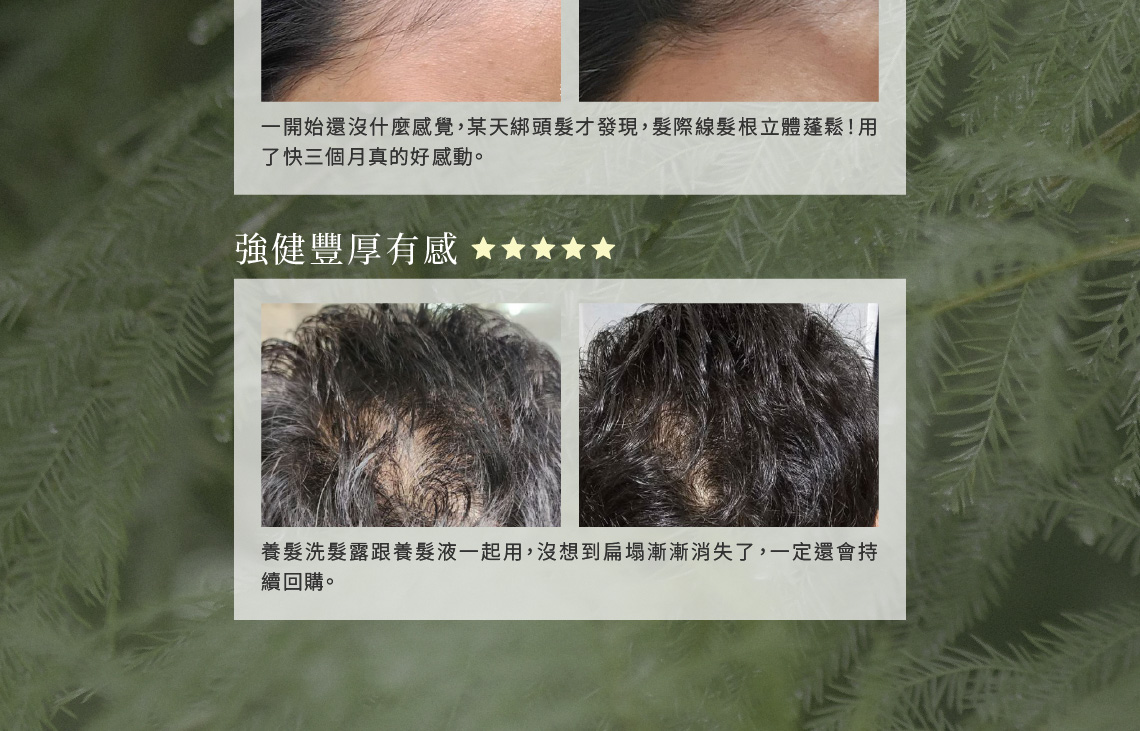 | 保濕滋養因子 | 深層補水,改善頭皮乾燥,減少乾癢不適,維持頭皮健康狀態。 |
