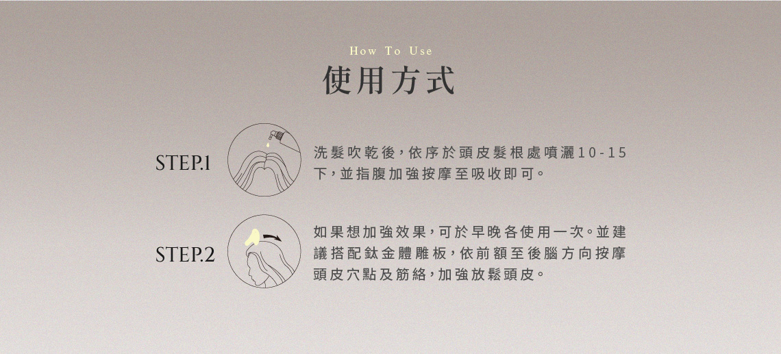 | 日常保養 (欲強化滋養頭皮者) | 洗髮並將頭髮吹乾後,於頭皮髮根處均勻噴灑 10-15 下,並以指腹加強按摩至精華液完全吸收即可。 |
