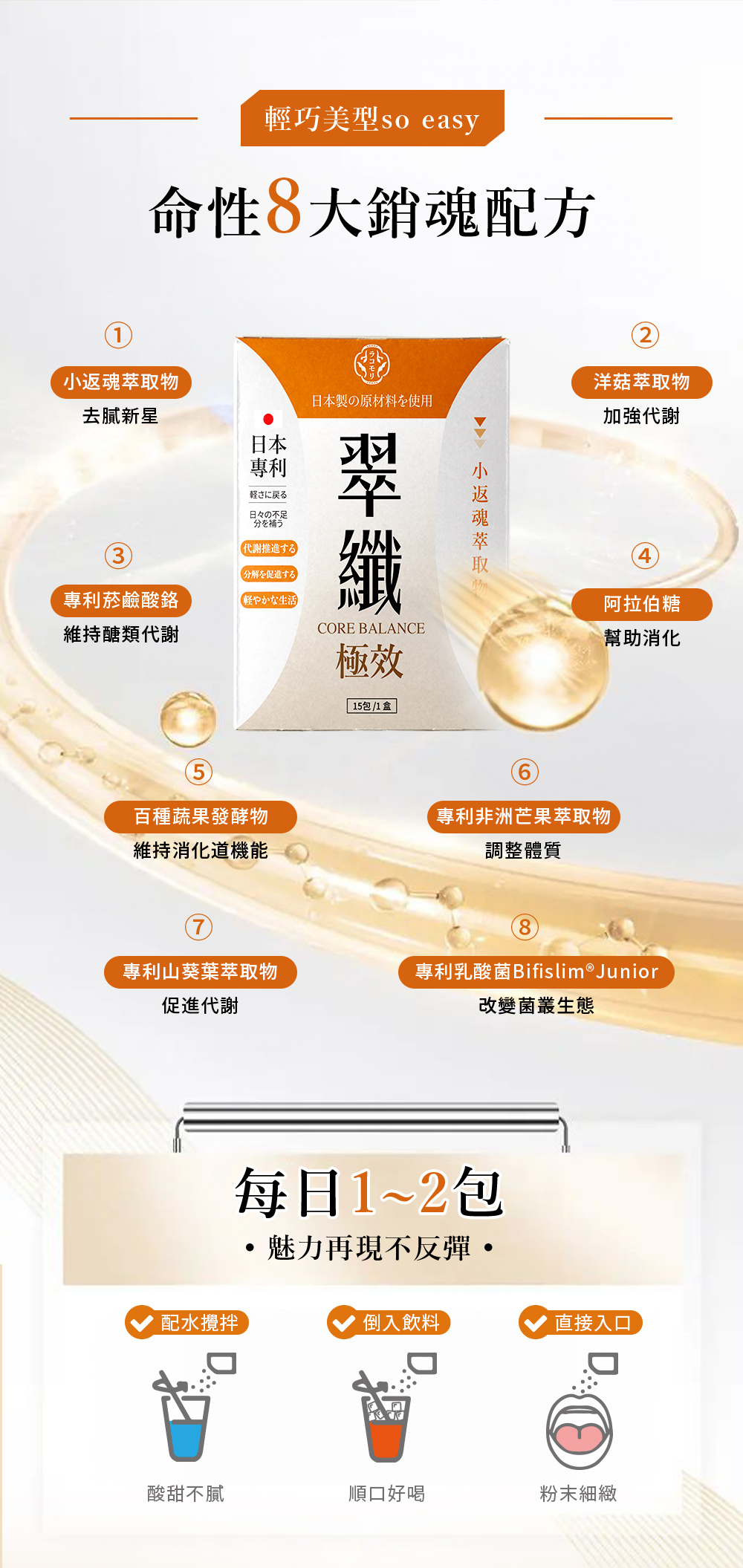 - 輕盈配方 適合每日保養或餐後飲用,男女皆宜。