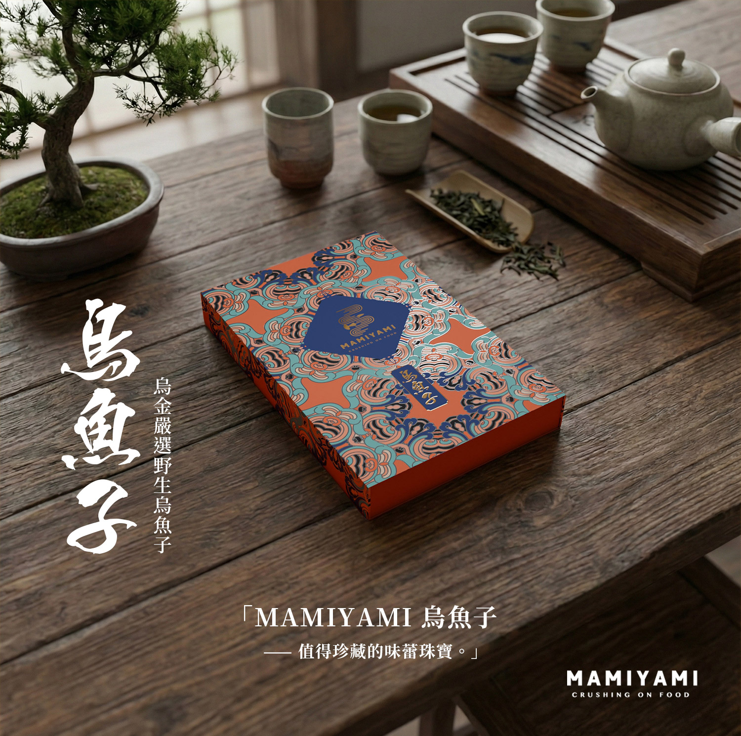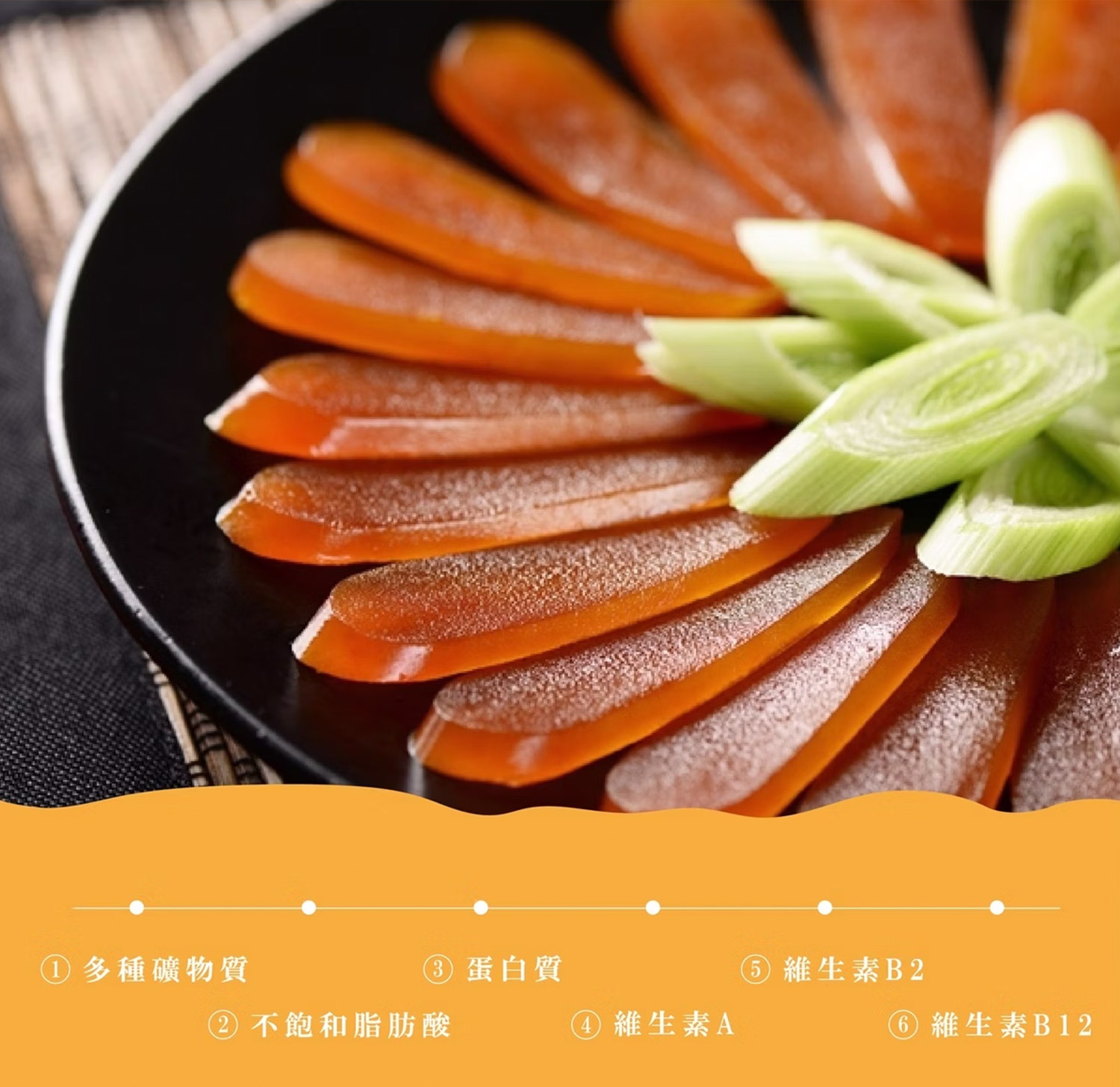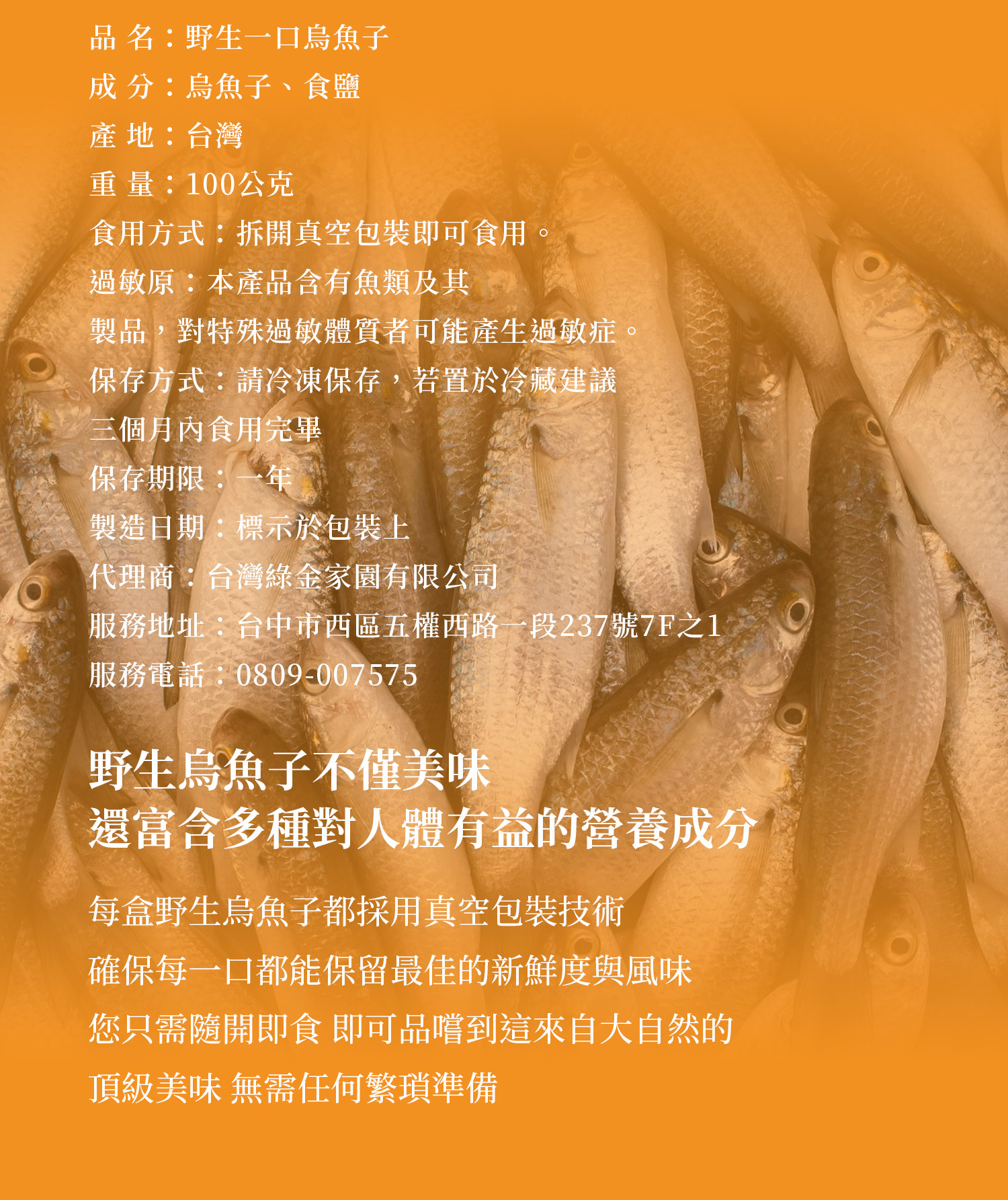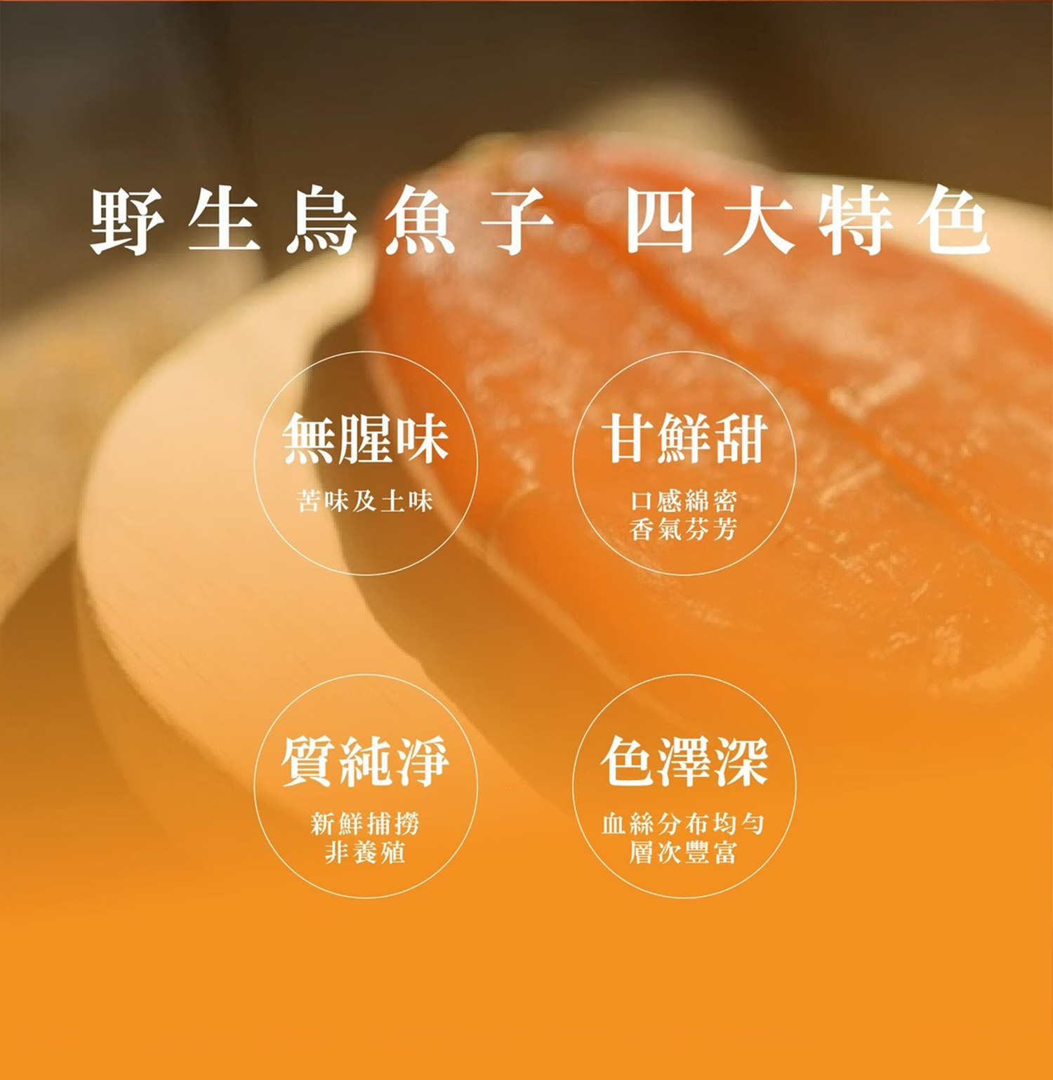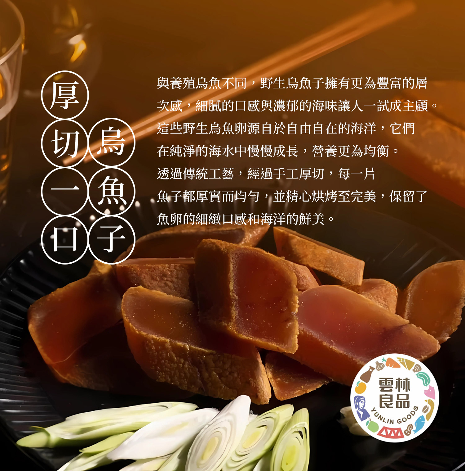 「值得珍藏的味蕾珠寶」。嚴選台灣野生烏魚子,富含多種營養成分。每片皆採真空包裝,鎖住最佳鮮度與風味,拆開即食,享受來自大自然的頂級美味。