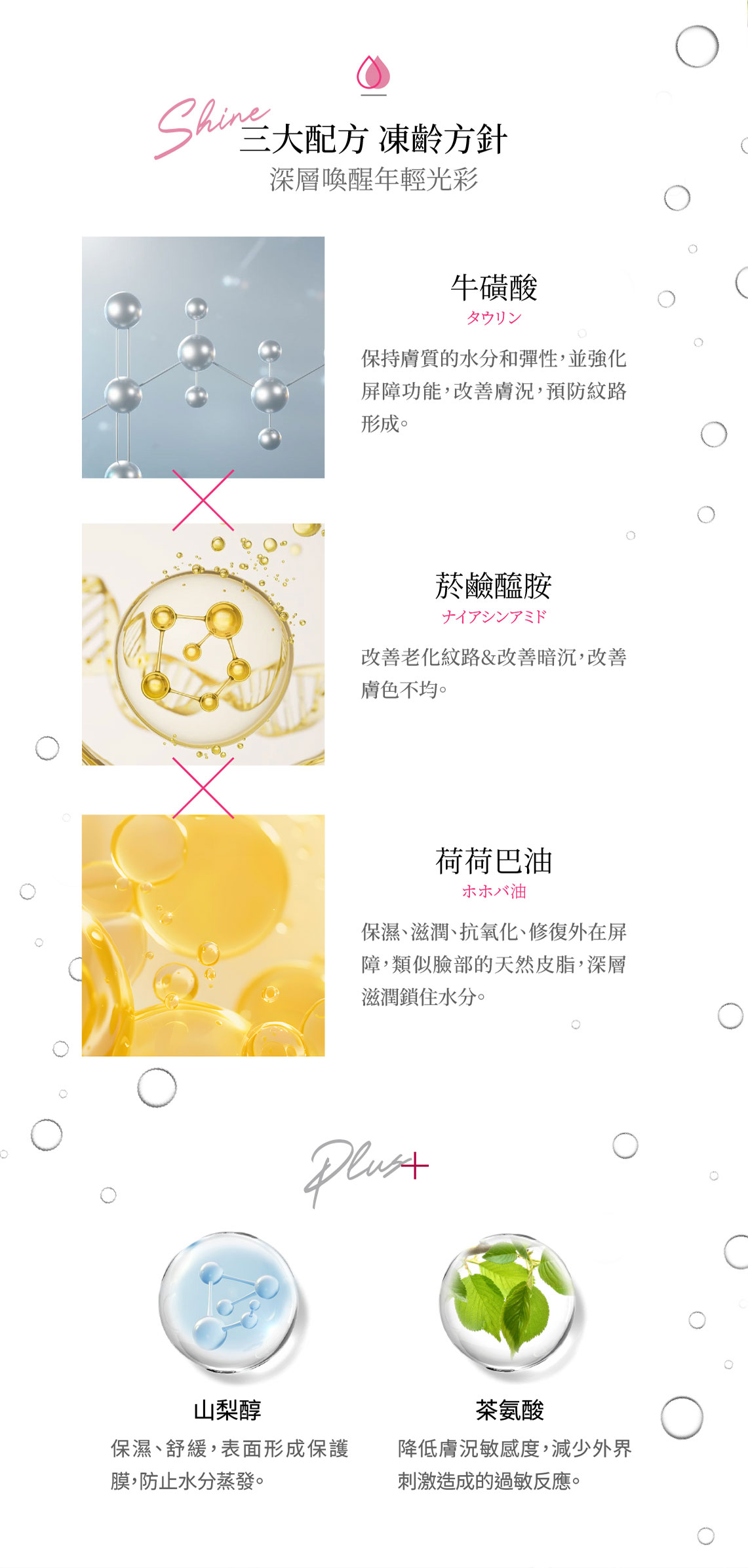 『針對紋路』牛磺酸、『最強保濕』玻尿酸、『對抗斑點』菸鹼醯胺