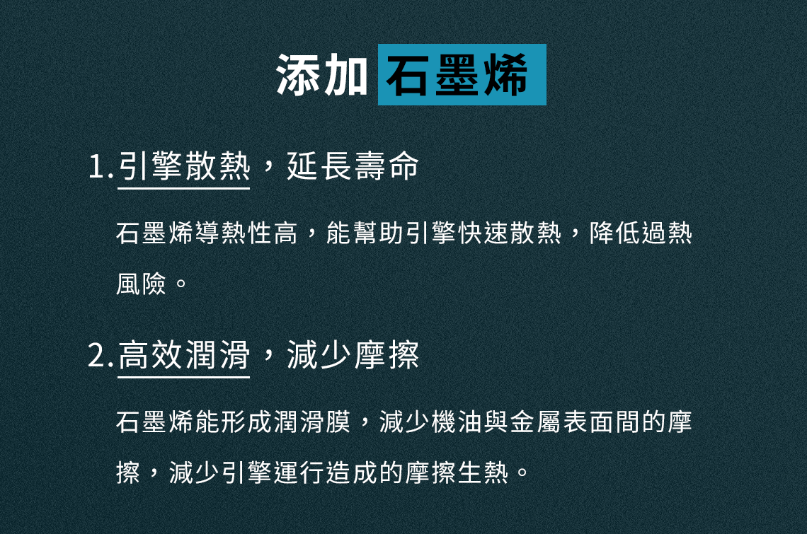 添加 石墨烯 幫助引擎散熱、延長壽命;高效潤滑降低油耗、提升燃油效率與馬力,並可減緩異音、帶來更安靜穩定的駕乘感。
