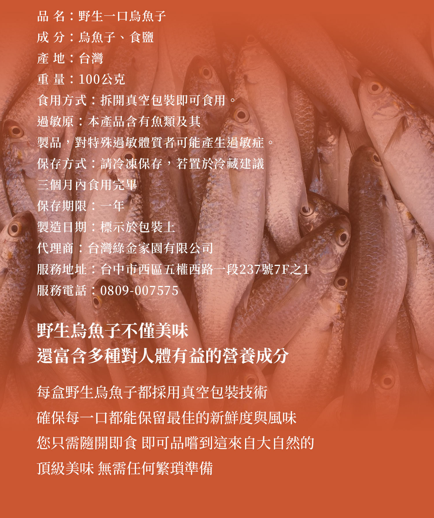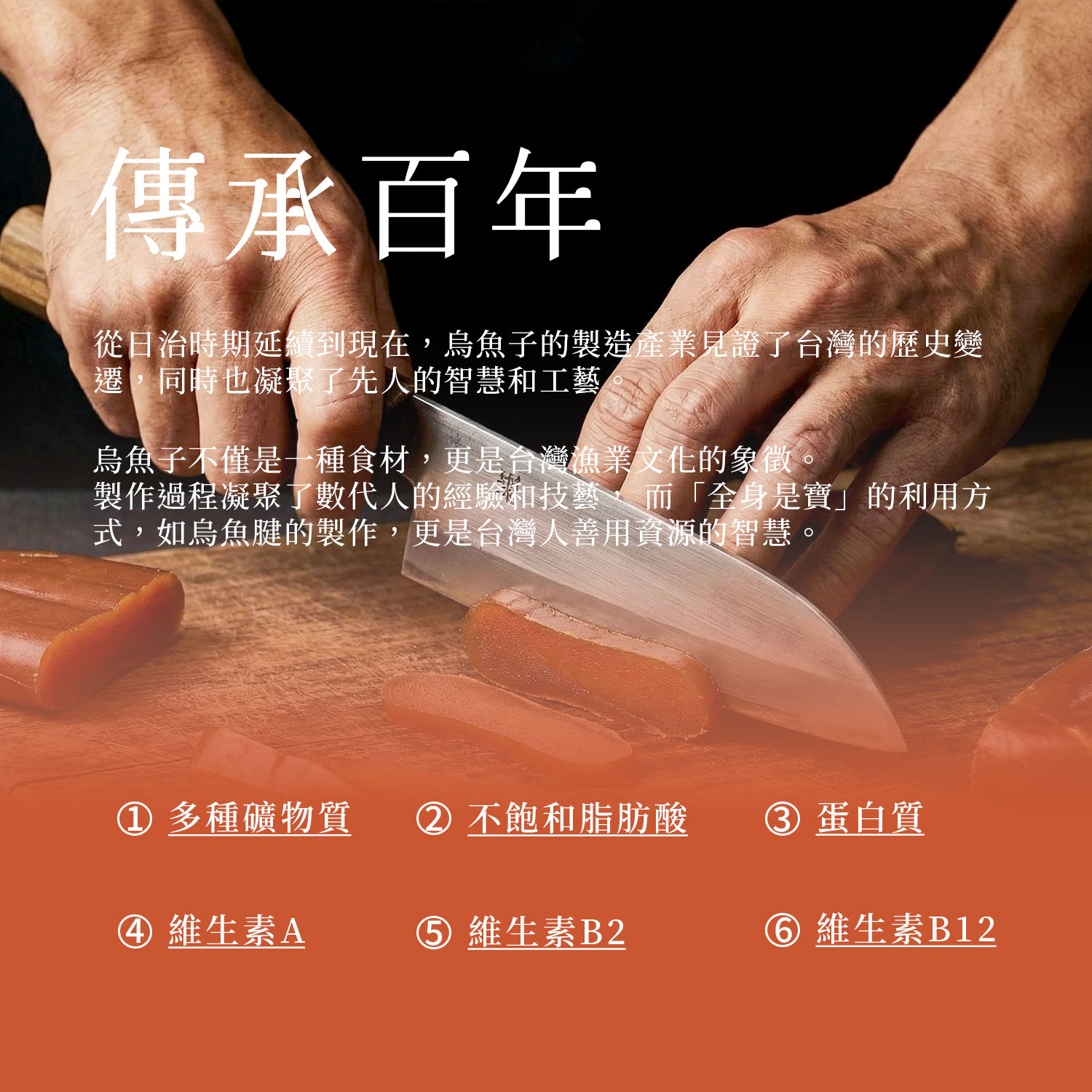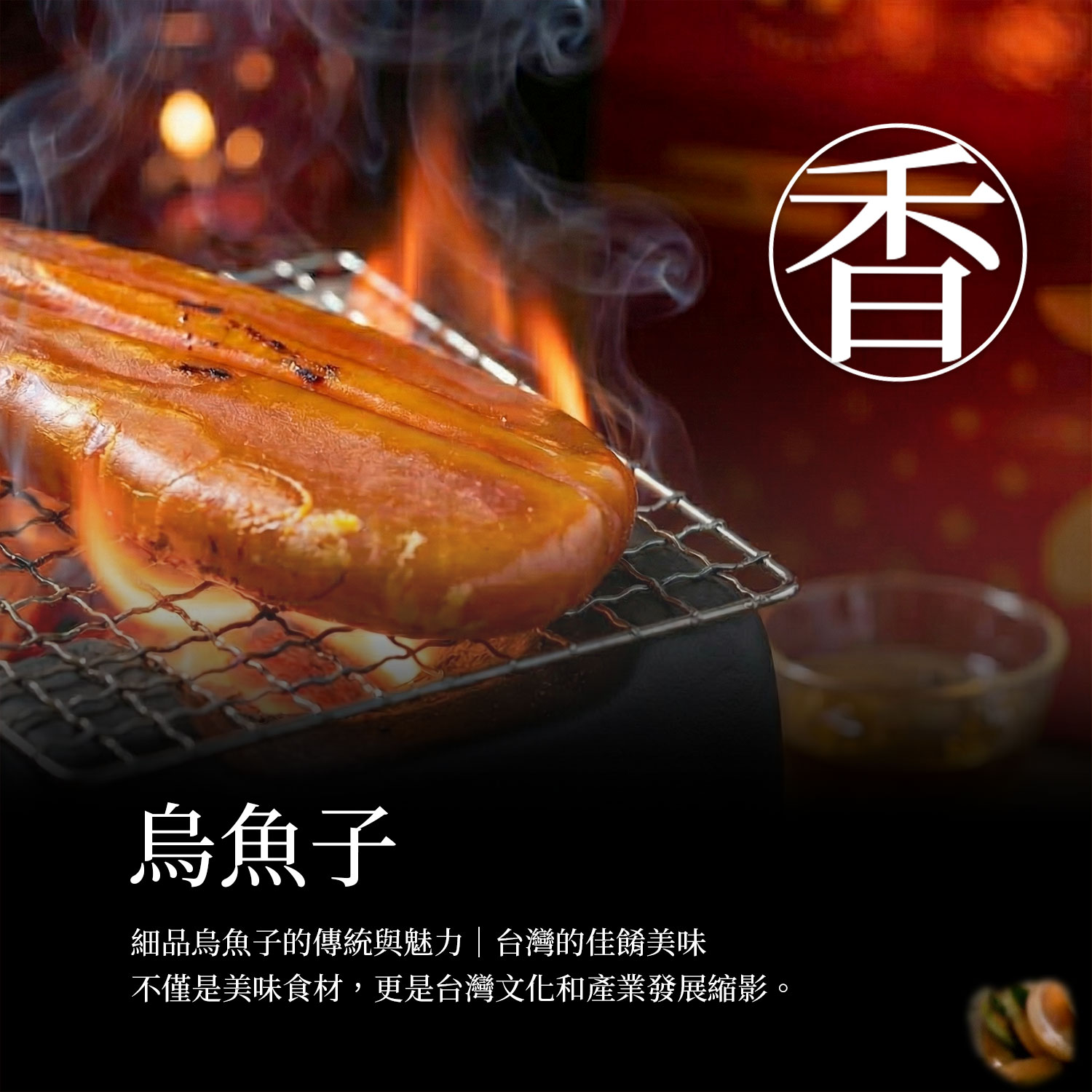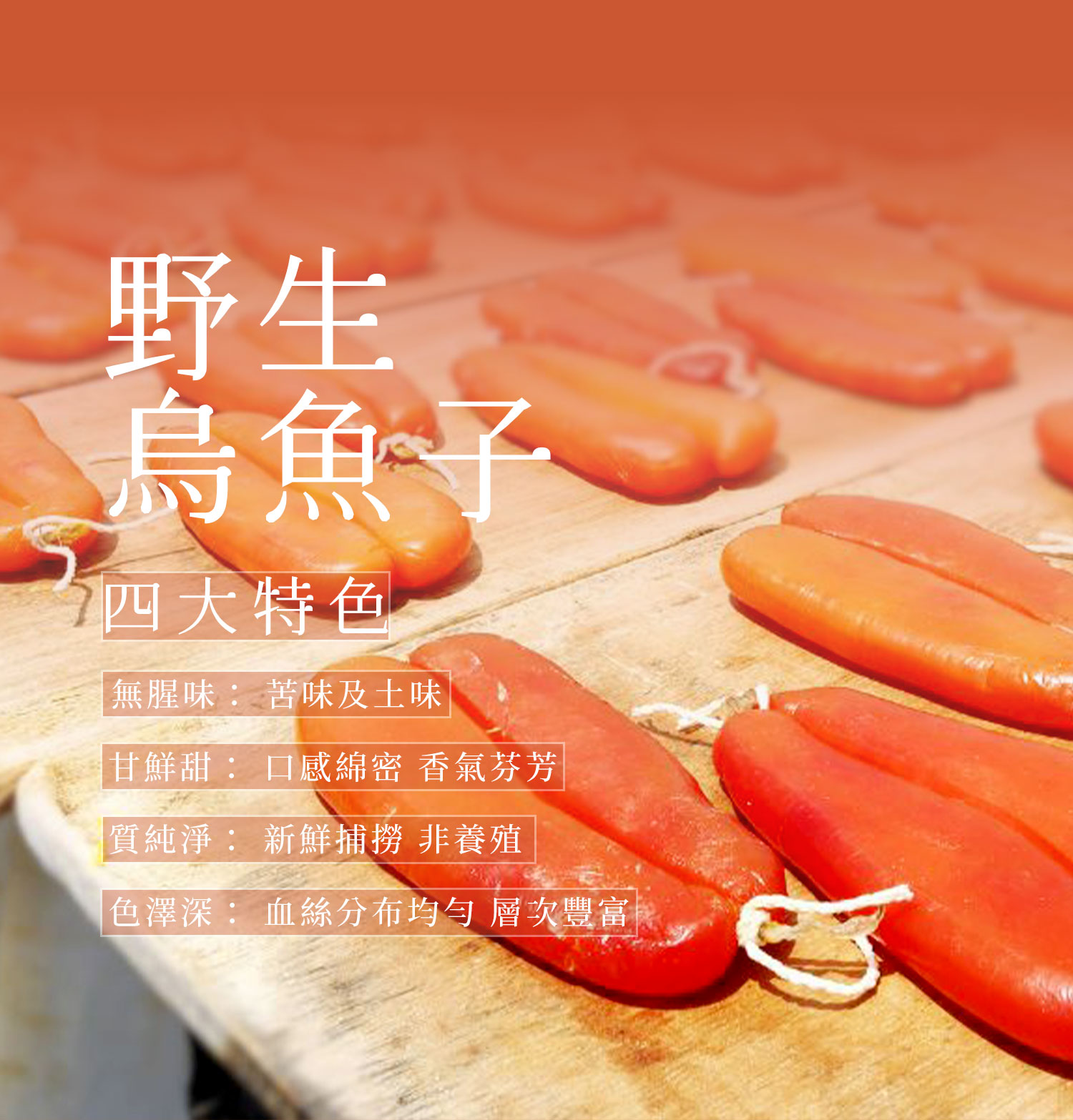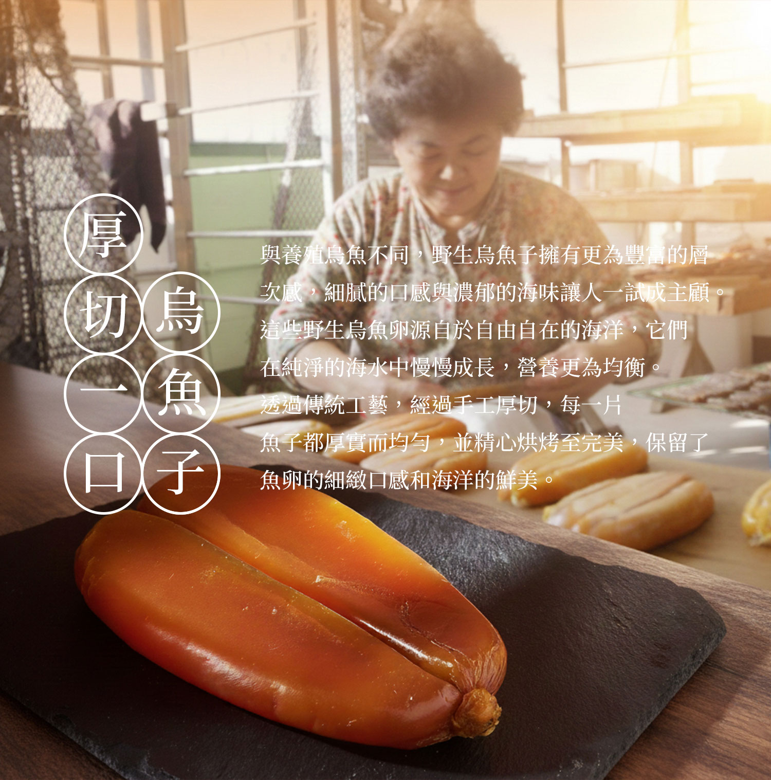 「值得珍藏的味蕾珠寶」。嚴選台灣野生烏魚子,富含多種營養成分。每片皆採真空包裝,鎖住最佳鮮度與風味,拆開即食,享受來自大自然的頂級美味。