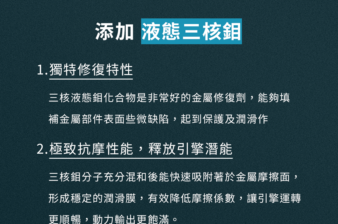 添加液態三核鉬幫助引擎散熱、延長壽命;高效潤滑降低油耗、提升燃油效率與馬力,並可減緩異音、帶來更安靜穩定的駕乘感。