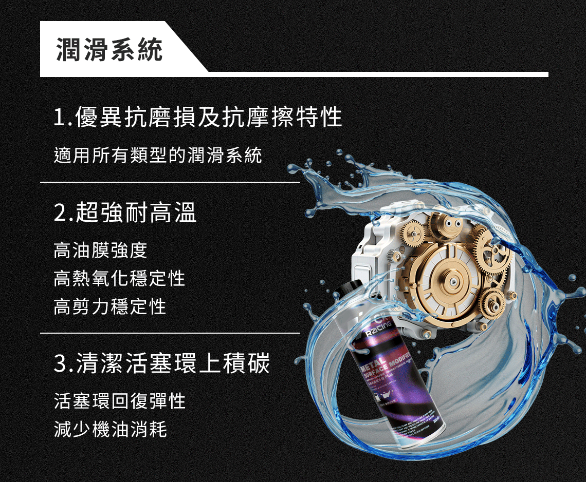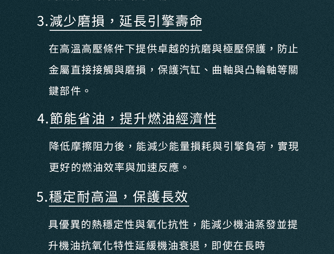 有效協助引擎散熱,延長引擎壽命。以賽車等級潤滑膜技術,提升燃油效率並增加馬力輸出。改善異音、運轉更安靜順暢,同時達到高效潤滑、降低油耗與防止積碳磨損。