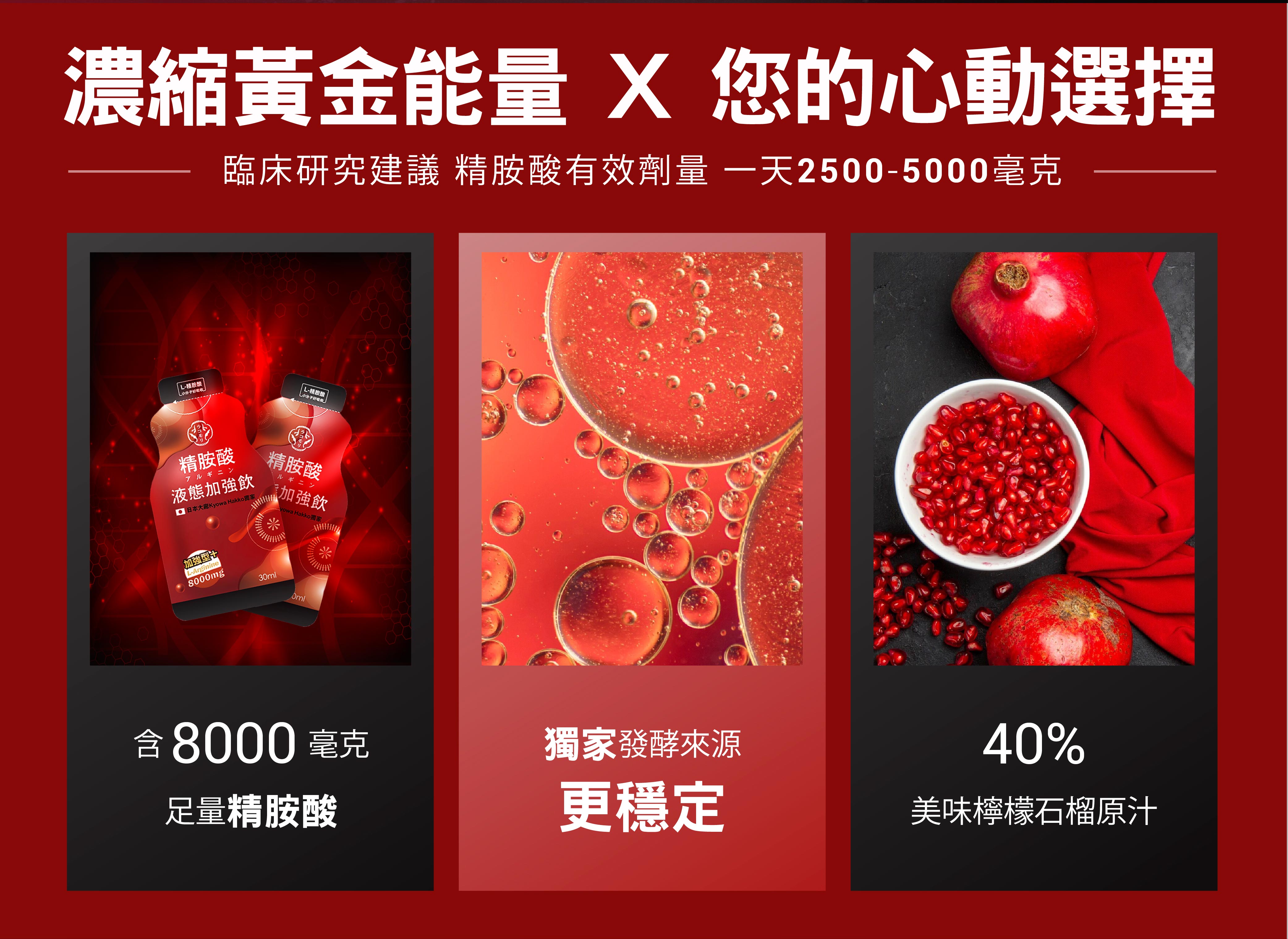 濃縮黃金能量 × 心動選擇:採用日本大廠 KYOWA 高純度左旋精胺酸,臨床建議每日有效範圍 2,500–5,000 mg。市售最高每包含量總計約 8,000 mg(以外盒標示為準),搭配蜜酪基底更穩定, 並以高比例果汁(40%)調味,酸甜順口、好吸收。