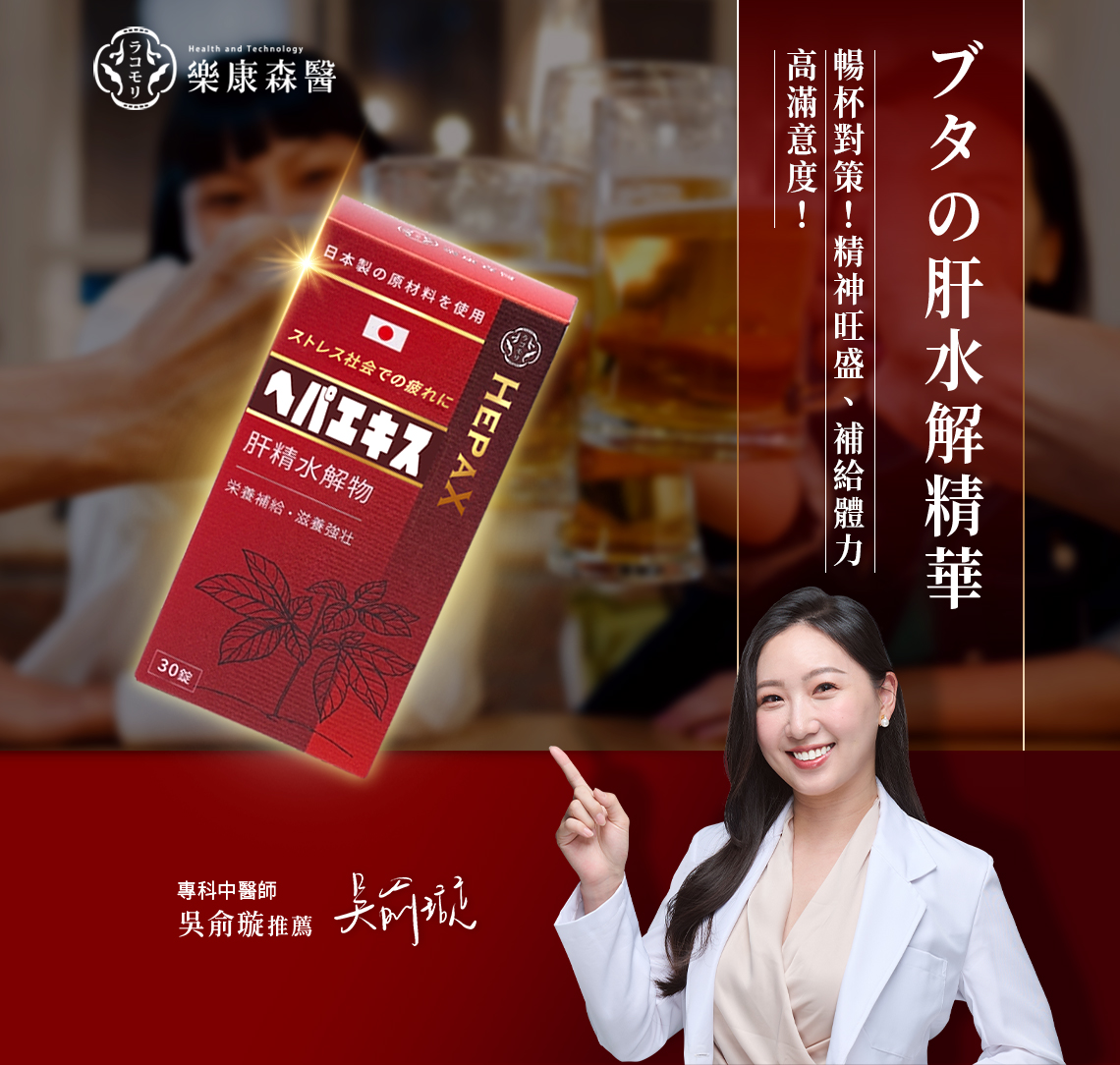 「暢杯神氣」的日常調整夥伴,以獨家 5 倍濃縮豬肝水解物為核心,小分子好搭配,並佐以廣島牡蠣精華與 L-胺基酸等素材,作為聚餐/晚睡後的規律保養搭配。