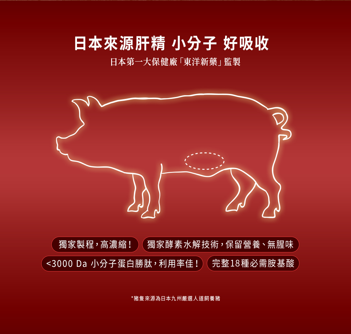 | 日本來源豬肝水解物(5× 濃縮) | <3000 Da 小分子蛋白胜肽;提供 18 種胺基酸等營養來源;好吸收、好補充,作為日常代謝節律與規律作息的搭配。 |