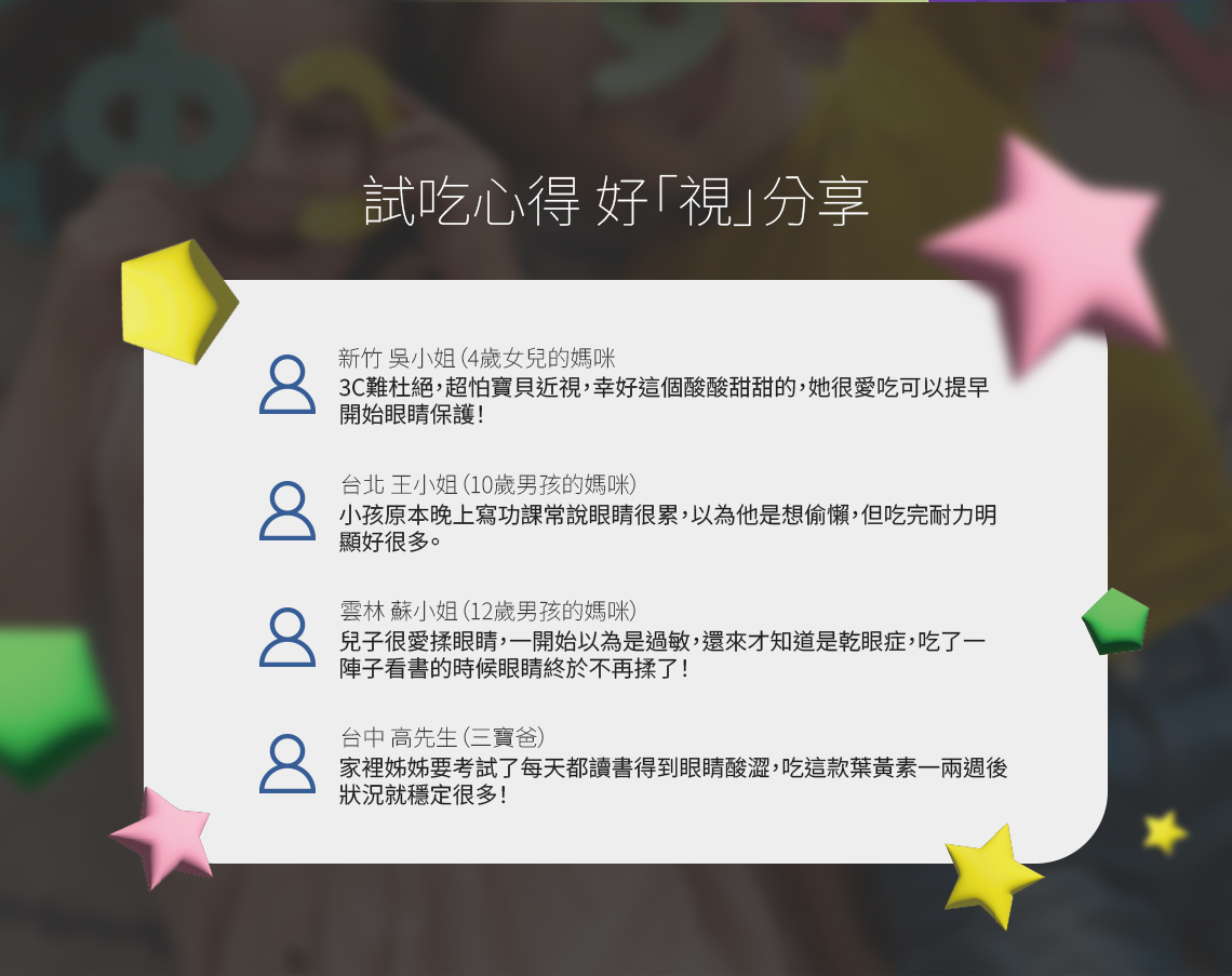 - 嚴選金盞花來源葉黃素,搭配玉米黃素與黑醋栗萃取。