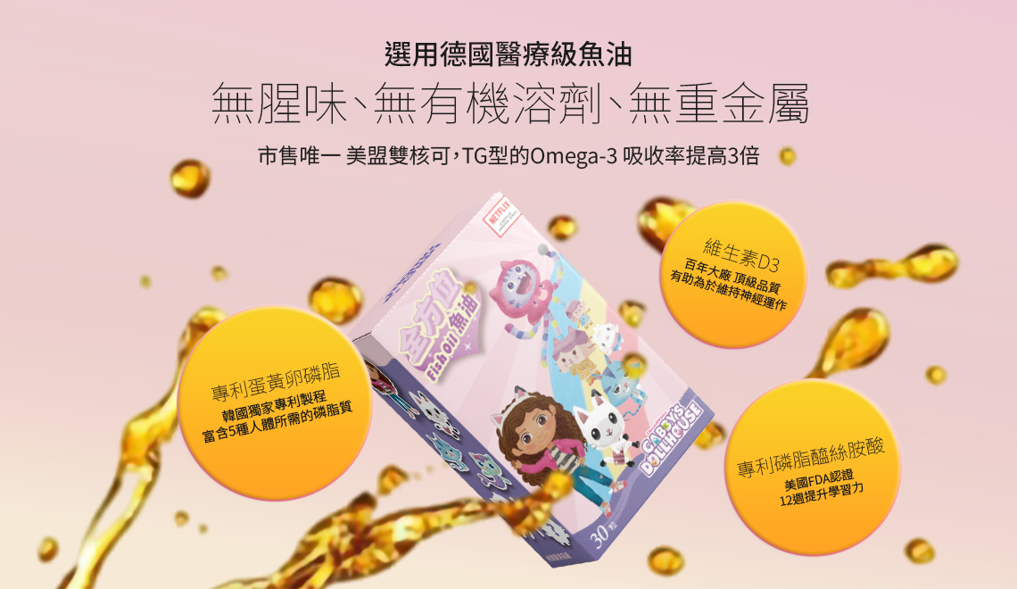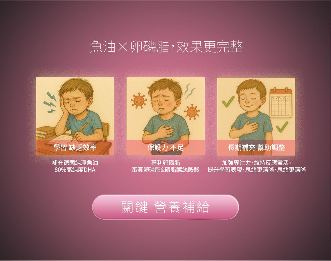 專為孩童設計的 DHA + 卵磷脂營養補給,幫助維持學習力與專注力!