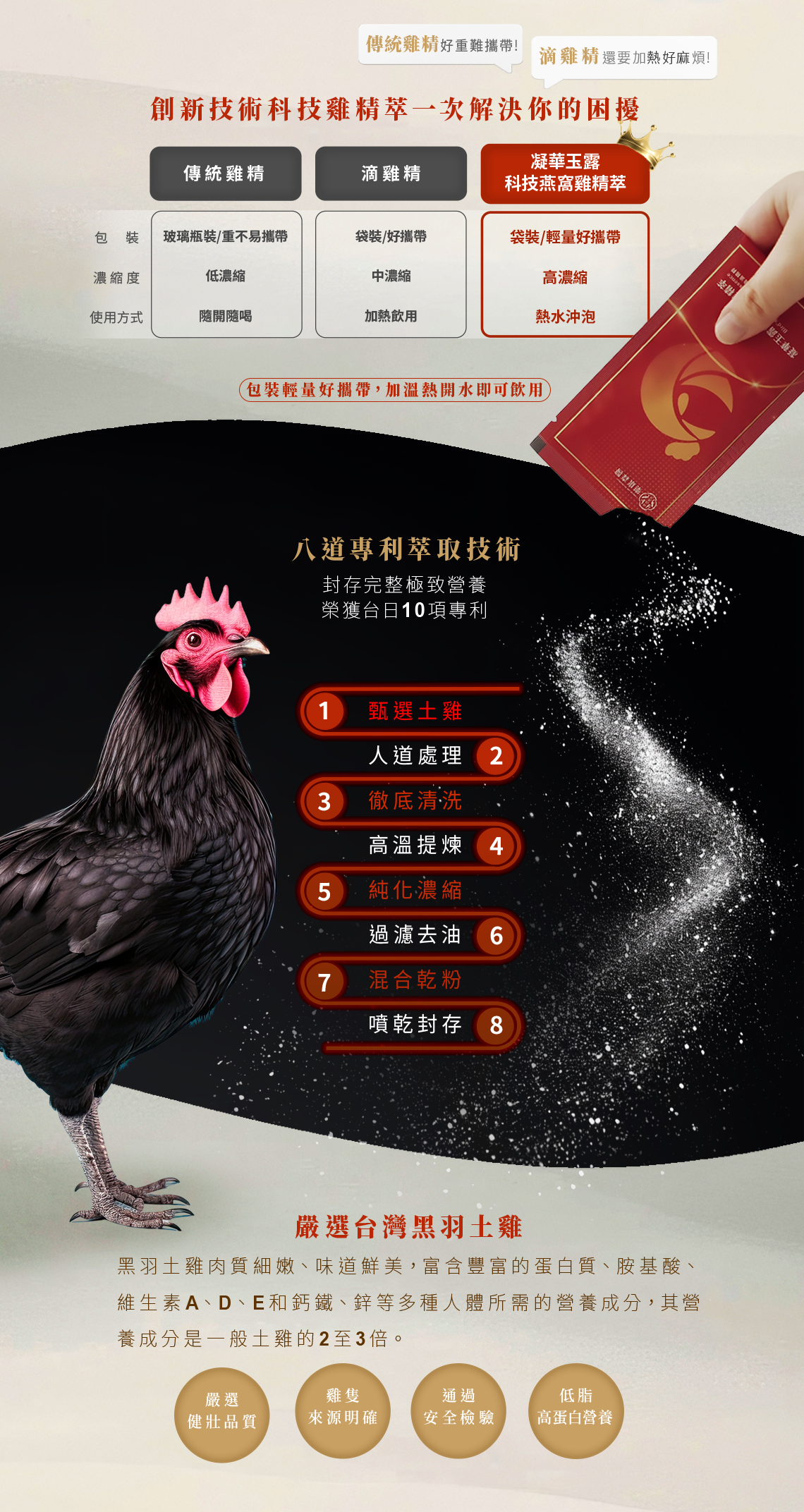 - 嚴選黑羽土雞:富含蛋白質、膠基酸與維生素 A、D、E,營養價值為一般土雞的 2~3 倍。