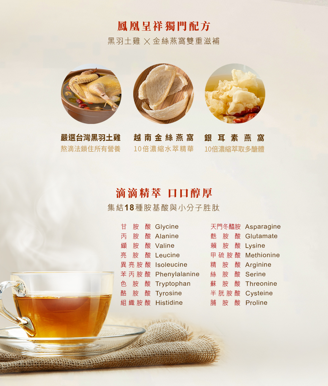 嚴選黑羽土雞搭配燕窩與銀耳三重滋補成分,富含膠基酸與小分子胜肽,補給營養、順口好吸收。