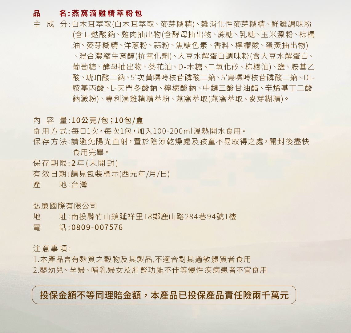 白木耳萃取(白木耳萃取、麥芽糊精)、難消化性麥芽糊精、鮮雞調味粉(含L-麩酸鈉、雞肉抽出物)、麻糖、乳糖、玉米澱粉、柑橘油、麥芽糊精、焦糖色素、香料、檸檬酸、蛋黃抽出物、混合濃縮生育醇(抗氧化劑)、大豆水解蛋白調味粉、葡萄糖、酵母抽出物、葵花油、D-木糖、二氧化矽、檸檬油、DL-蘋果酸鈉、專利滴雞精萃粉末、燕窩萃取。