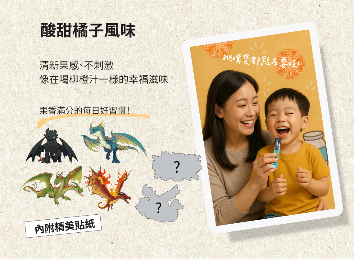 - 酸甜橘子風味,孩子更容易接受。