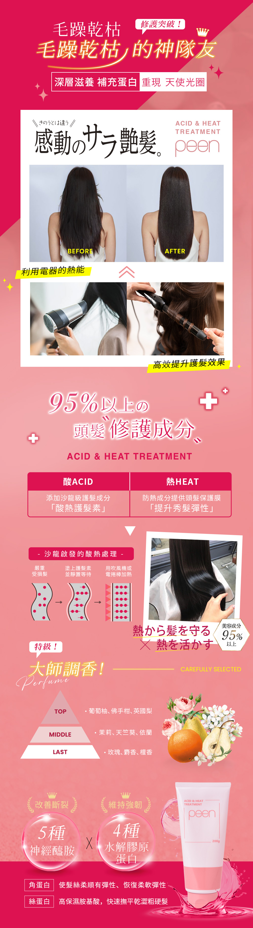 ・利用吹風機或電棒的熱能,可提升酸熱護髮素的修護效果(即使不使用時仍能達到護髮效果)