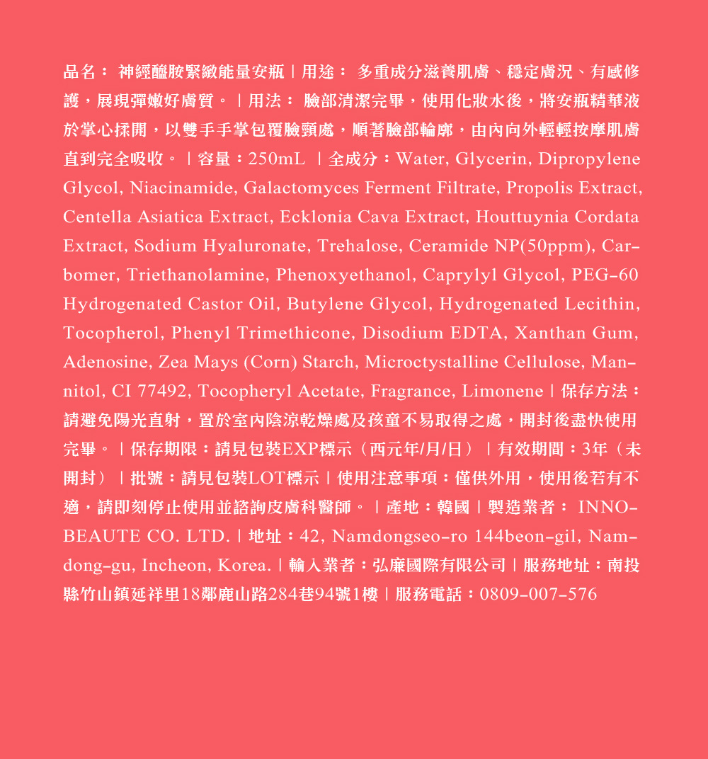・臉部清潔完畢,使用化妝水後,將安瓶華液於掌心揉開,以雙手手掌包覆臉頸處順著臉部輪廓,由內向外輕輕按摩肌膚直到完全吸收。