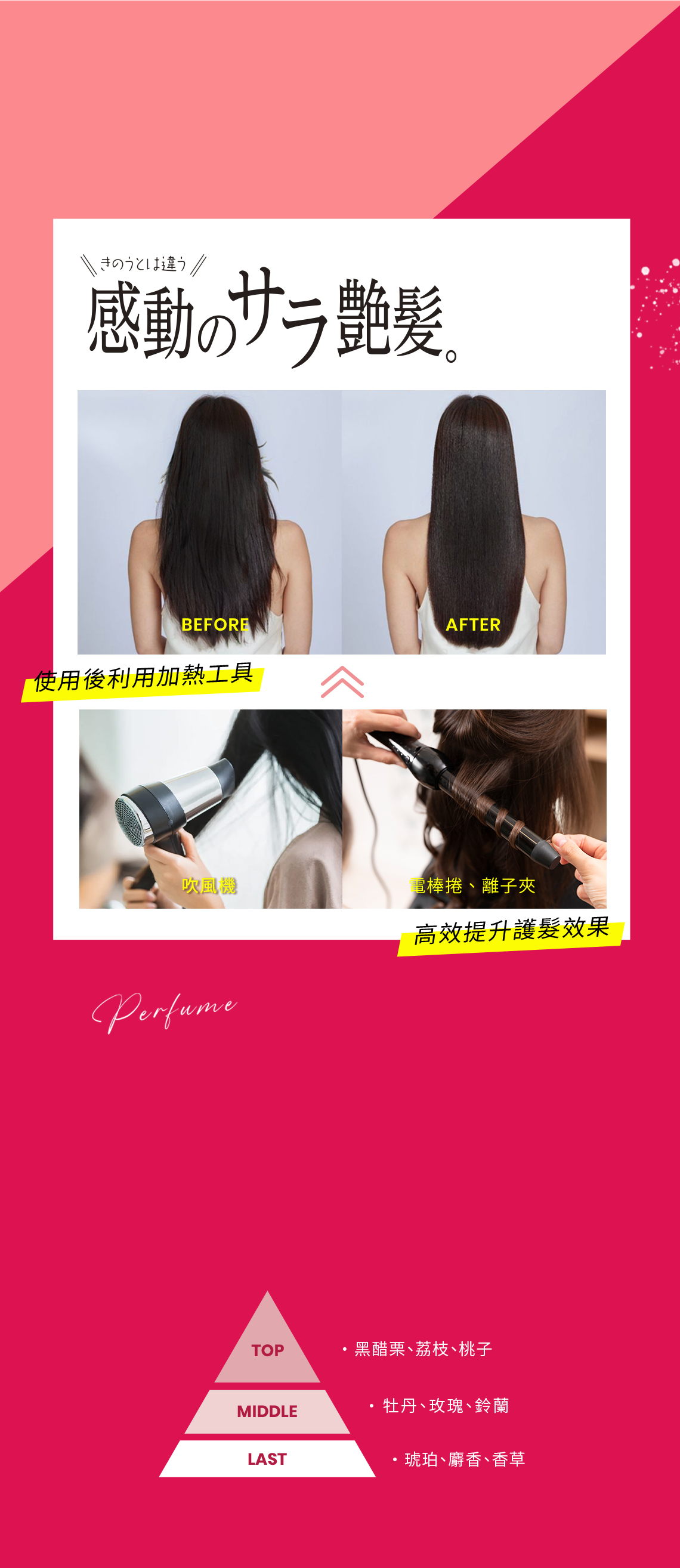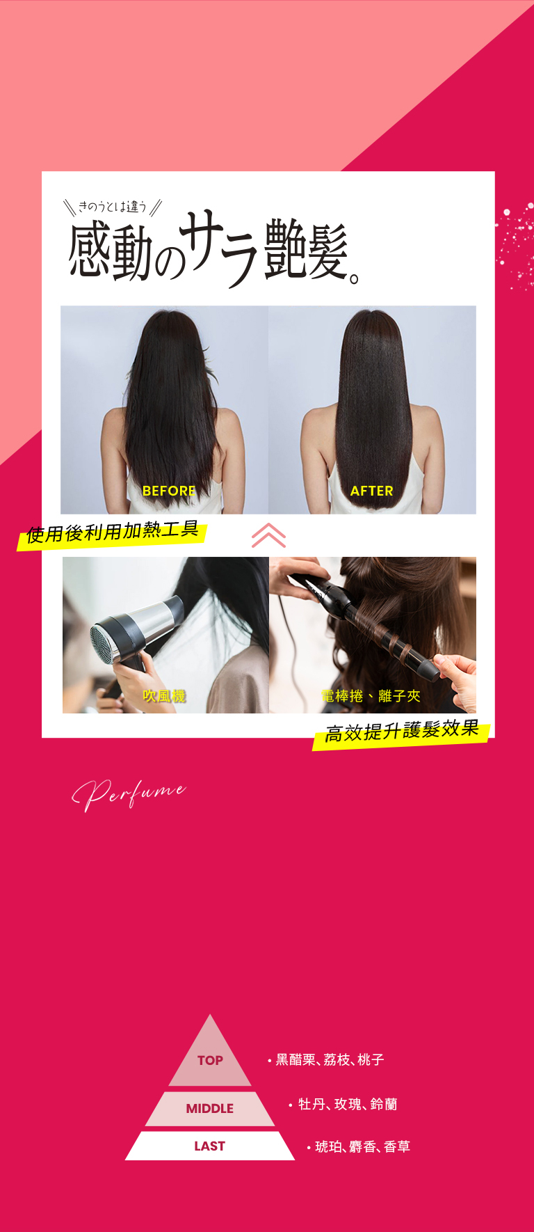 【使用方式】頭髮吹半乾後適量塗抹於髮尾乾燥處,再用加熱工具讓修護效果更升級