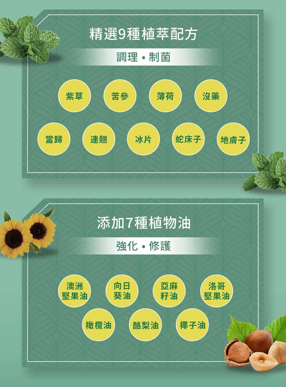 - 9 種植萃配方:紫草根、黃芩、甘草、積雪草、迷迭香、洋甘菊等,調理肌膚環境、降低細菌風險。