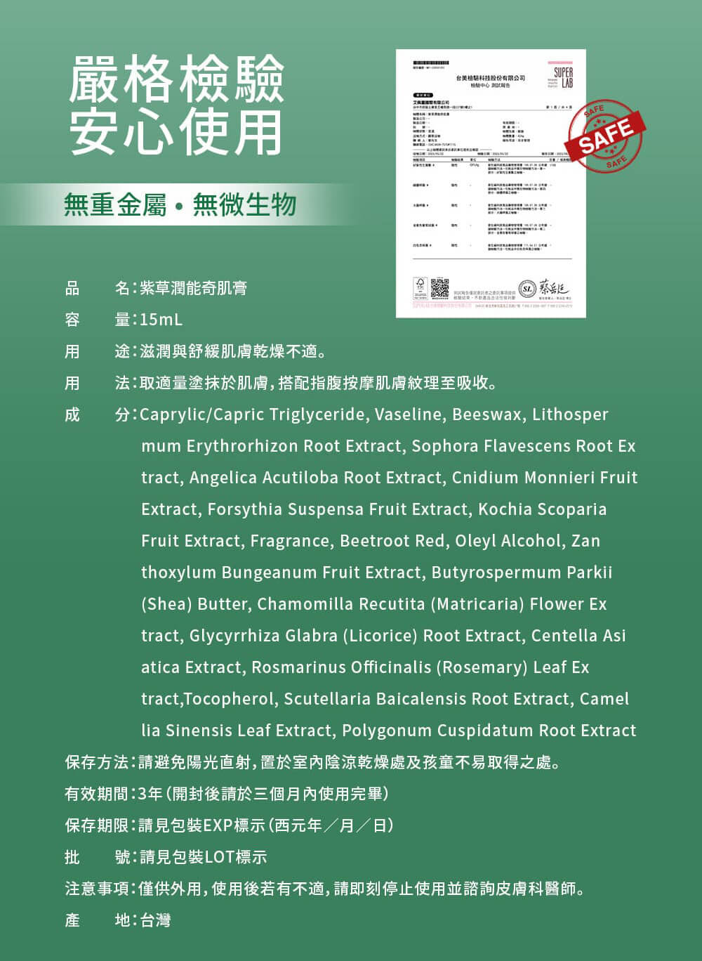 | 主要機能成分(擇要) | 紫草根萃取、黃芩根萃取、當歸/防風果/連翹果等多重植萃;洋甘菊、迷迭香等植物精油;乳木果油、蜂蠟、維他命 E(Tocopherol)等保濕修護基底。 |