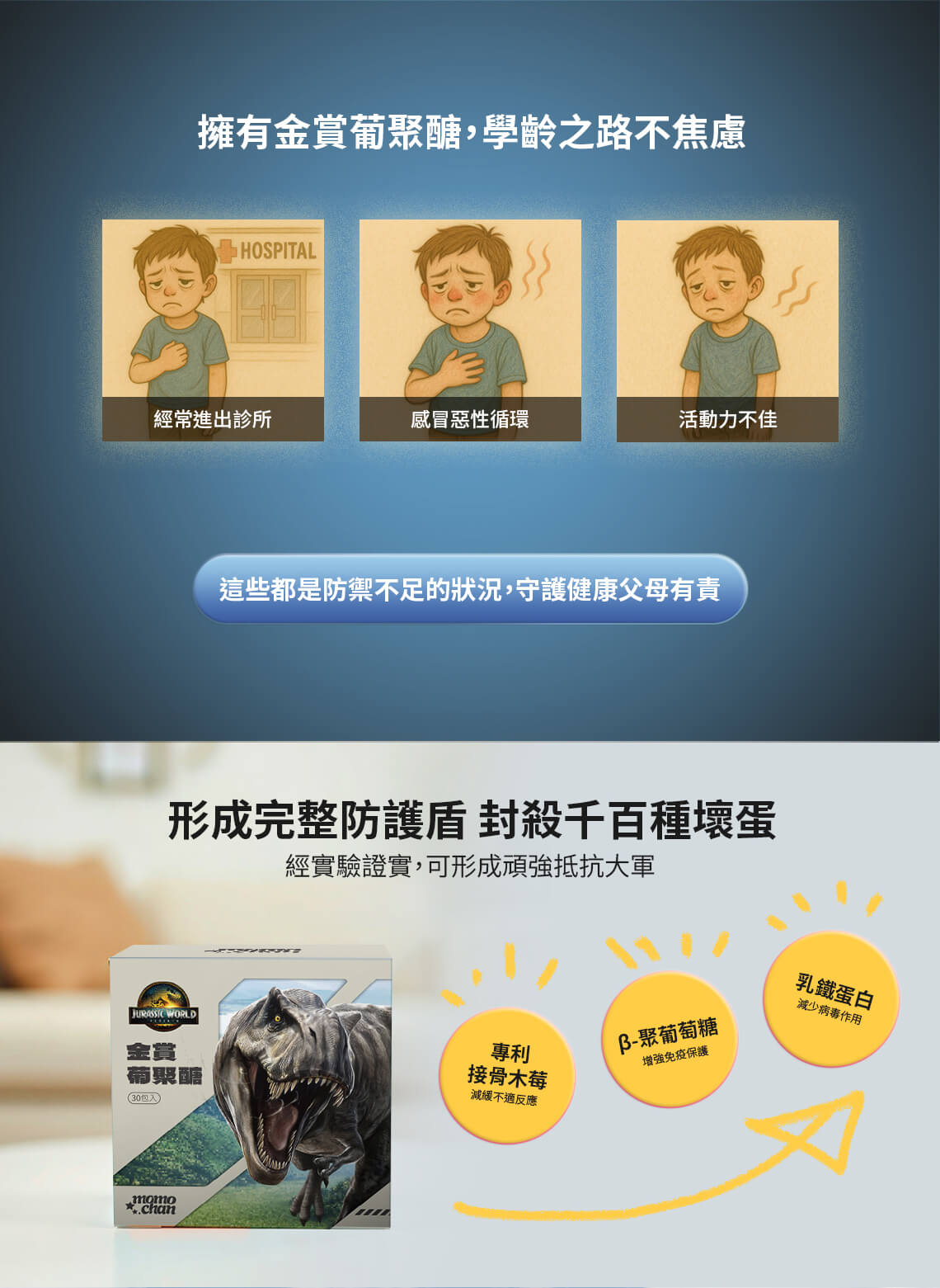 金賞葡聚醣提供日常防護營養,陽光 D+鈣幫助維持骨骼與牙齒健康。
