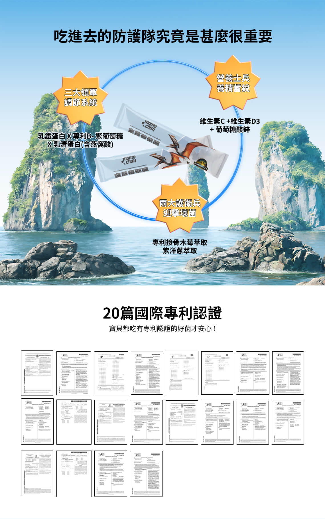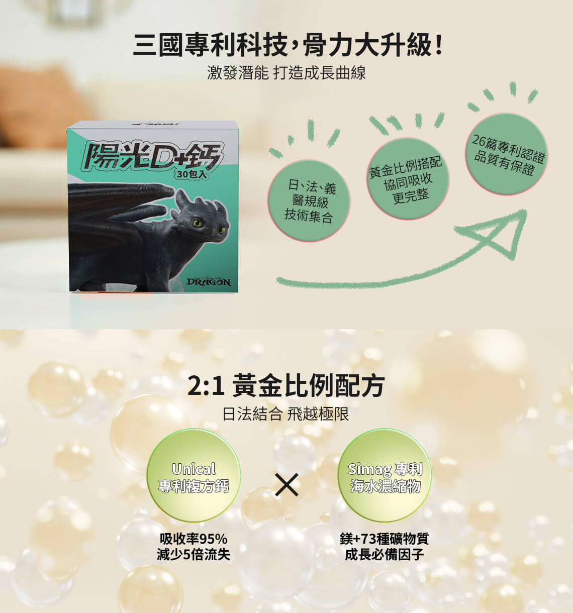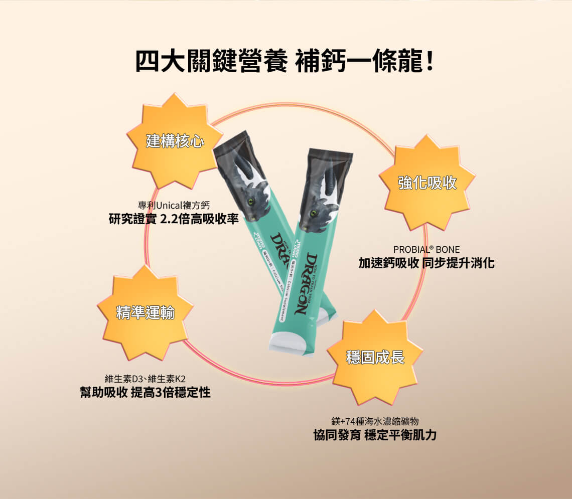 | ★ 日本專利 Probiām™ Bone | 專利乳酸菌鈣配方,協助鈣質吸收,補足日常攝取不足。 |