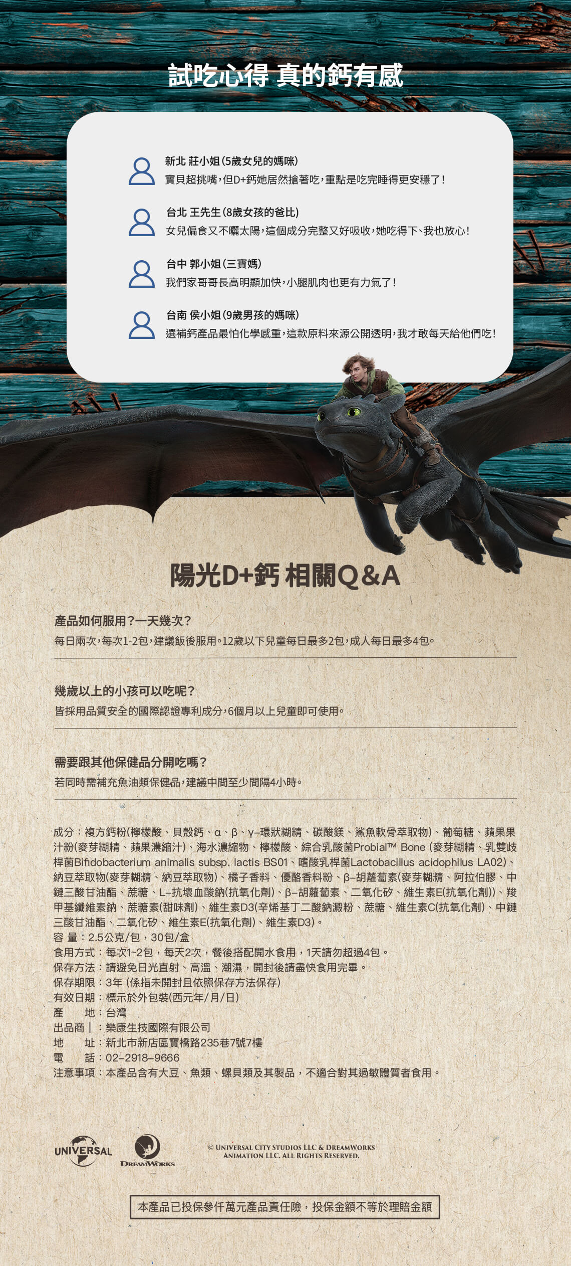 - 陽光 D+鈣 採用 Probiām™ Bone 鈣吸收配方,搭配維生素 D3、K2,協助鈣質吸收與利用。