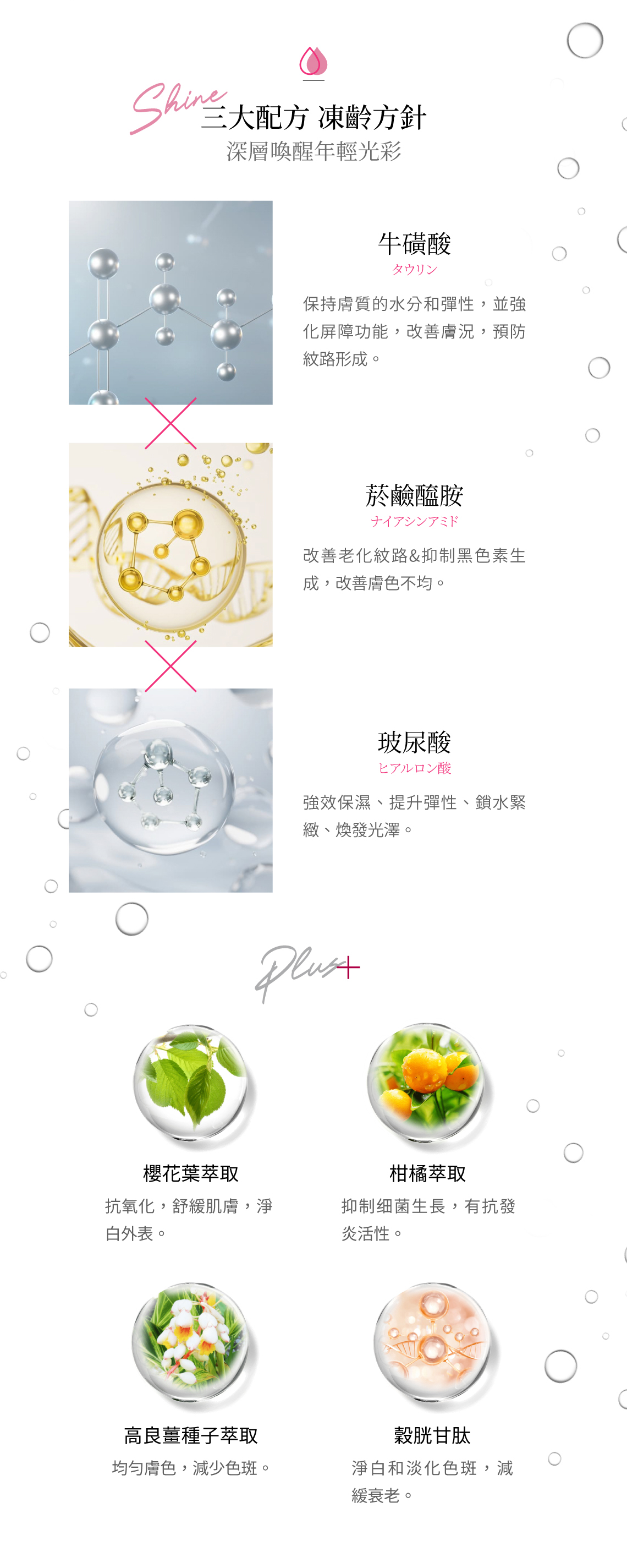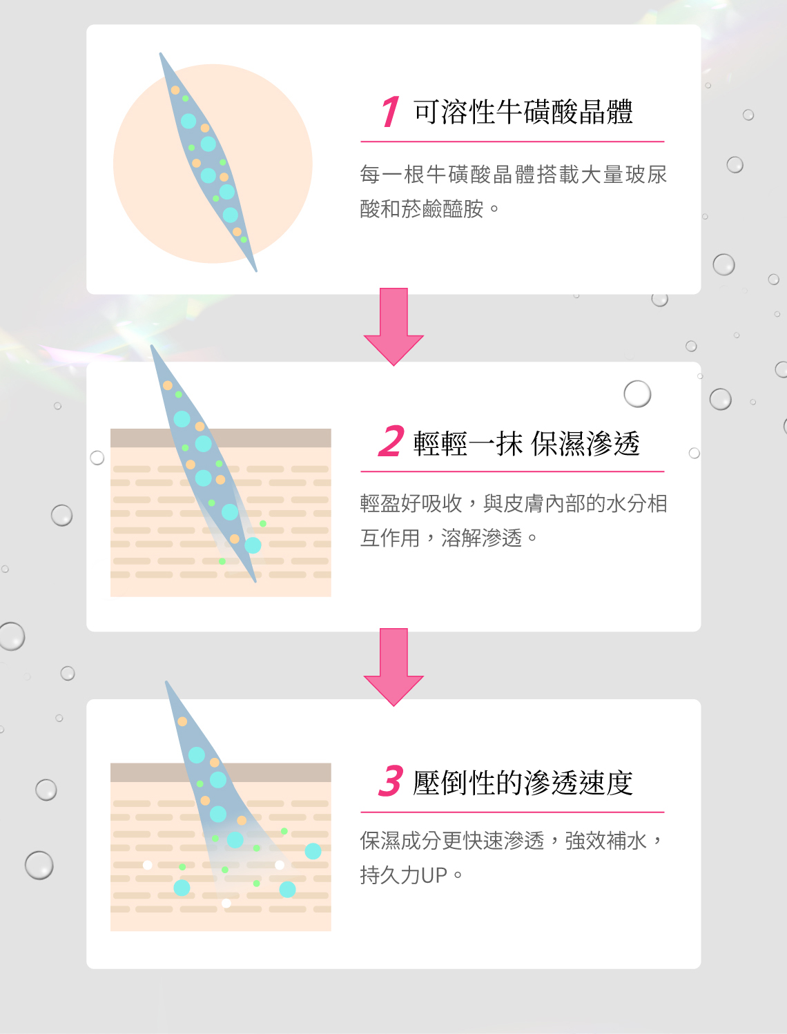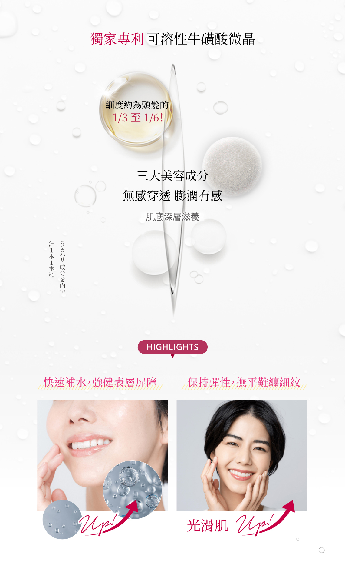 『針對紋路』牛磺酸、『最強保濕』玻尿酸、『對抗斑點』菸鹼醯胺