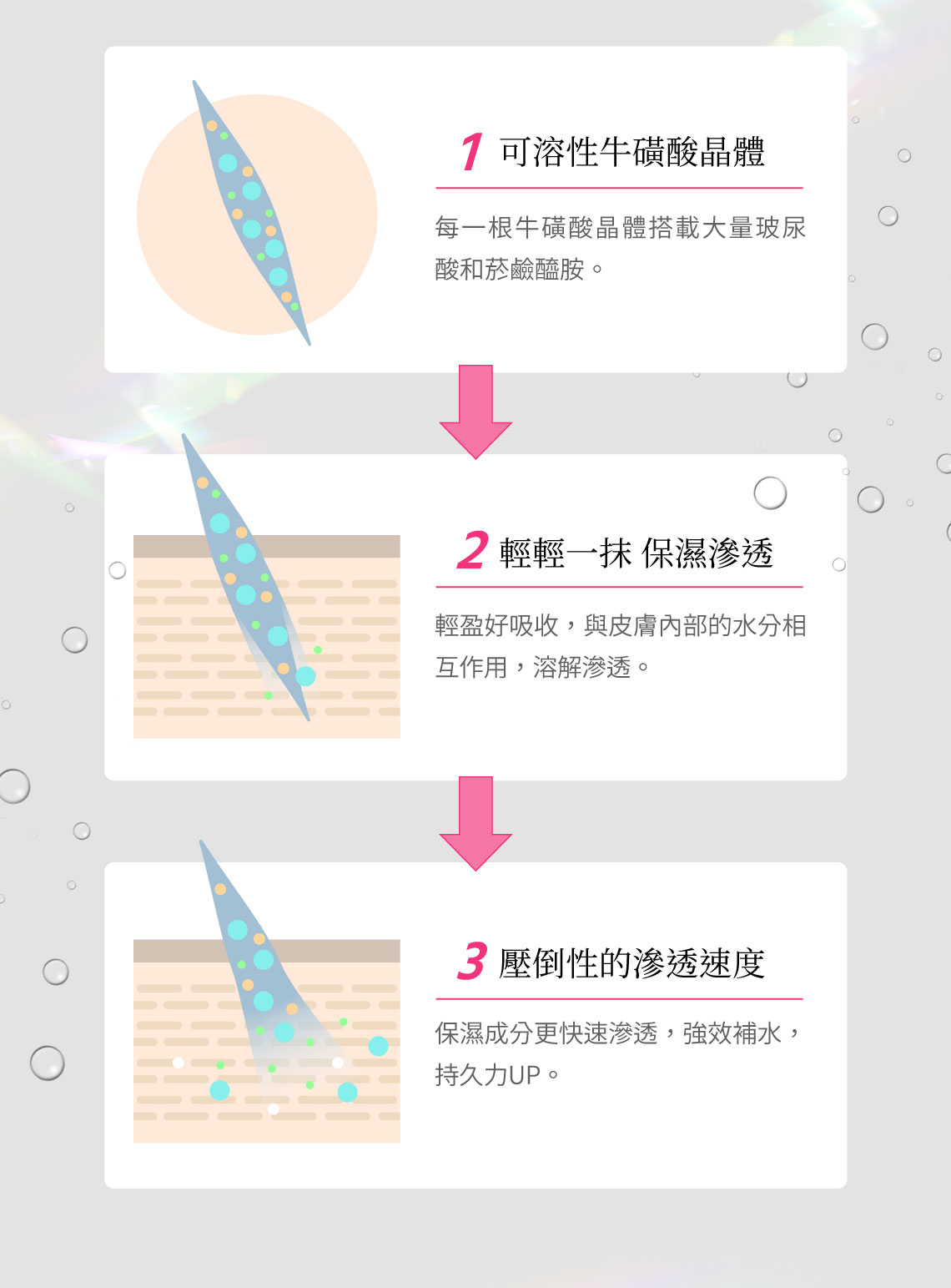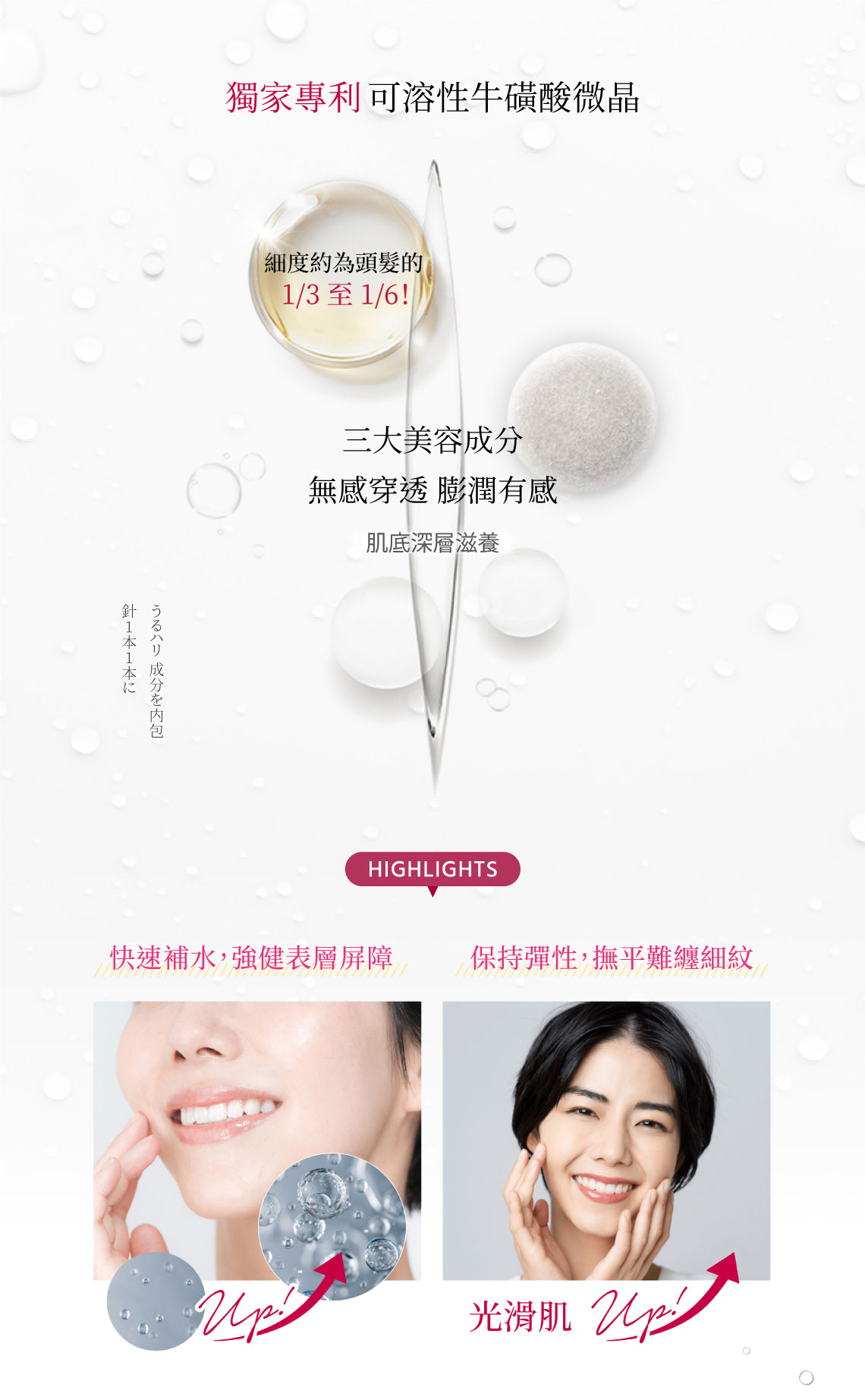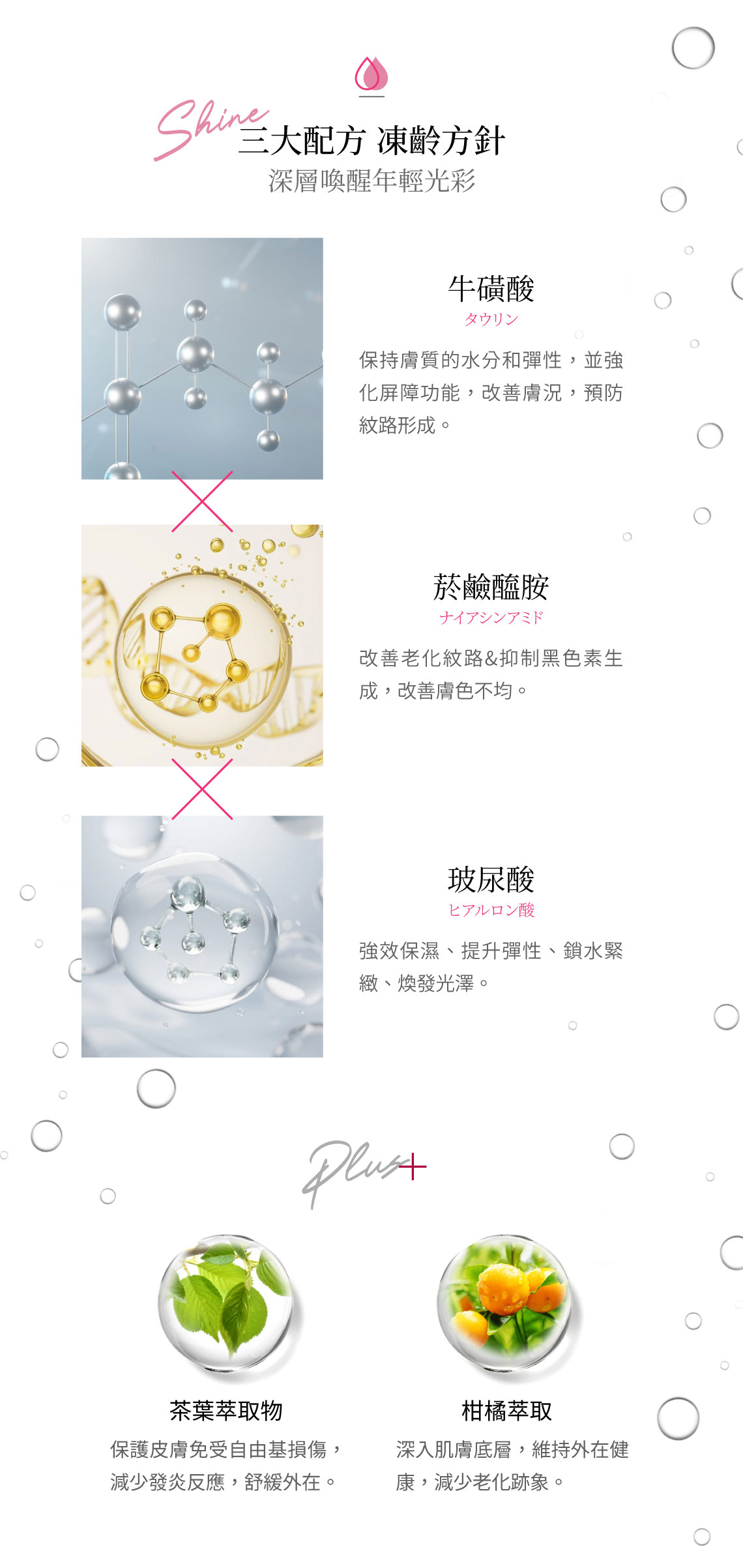 『針對紋路』牛磺酸、『最強保濕』玻尿酸、『對抗斑點』菸鹼醯胺