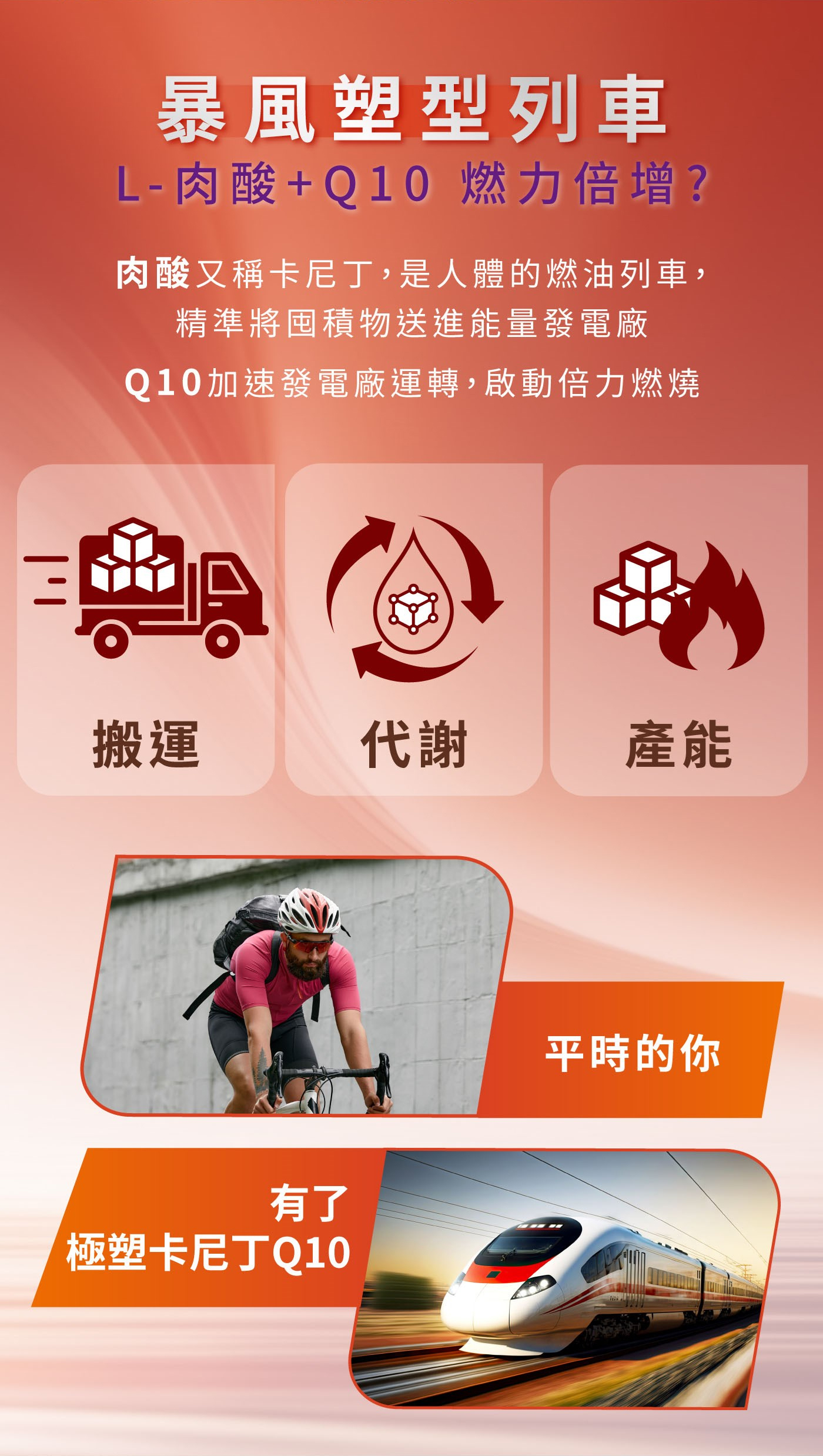 | L-卡尼丁(L-Carnitine) | 卡尼丁Q10 | 參與脂肪運輸至粒線體,支持運動表現與能量代謝。 |