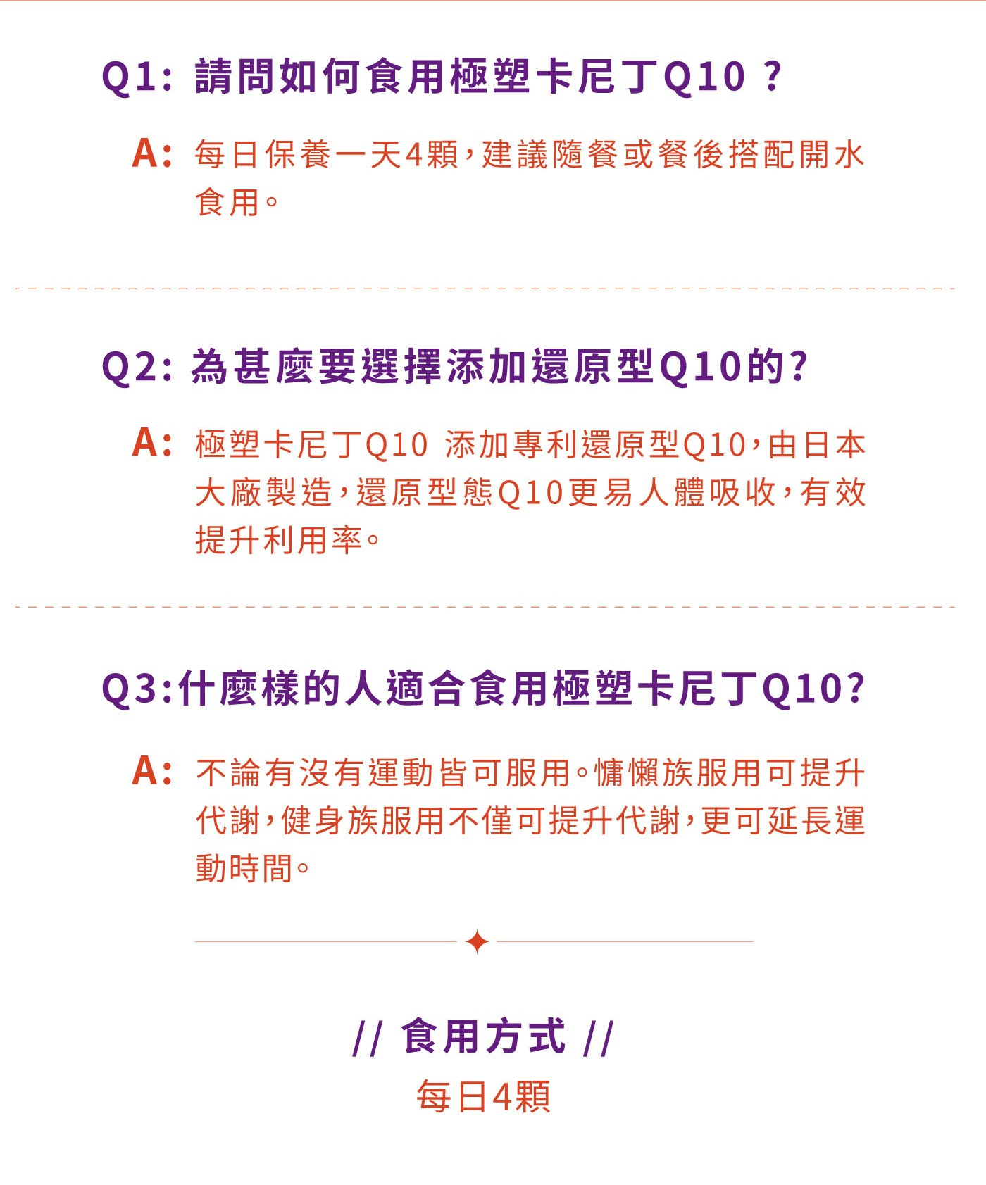 | 🏃 運動表現與能量補給 | 極塑卡尼丁Q10 | 保養每日 4 顆,建議飯後搭配開水食用 | L-卡尼丁與還原型Q10支援能量鏈;訓練日可分次補充。 |