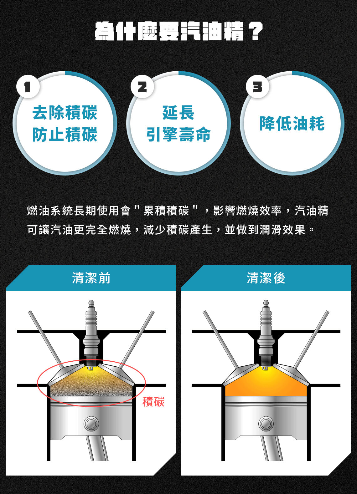| 汽車 | 每次加油前可添加一瓶(一瓶對應40公升) | 使用前搖勻,加入 汽油孔,發動後運轉 5–10 分鐘讓油精分佈引擎內。 |