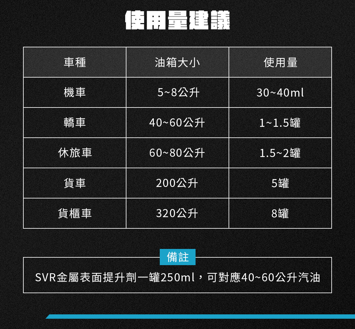 | 機車 | 每次加油前使用,一次約50ml(依照油箱大小調整) | 加油前先添加並短暫運轉,有助清潔與潤滑。 |